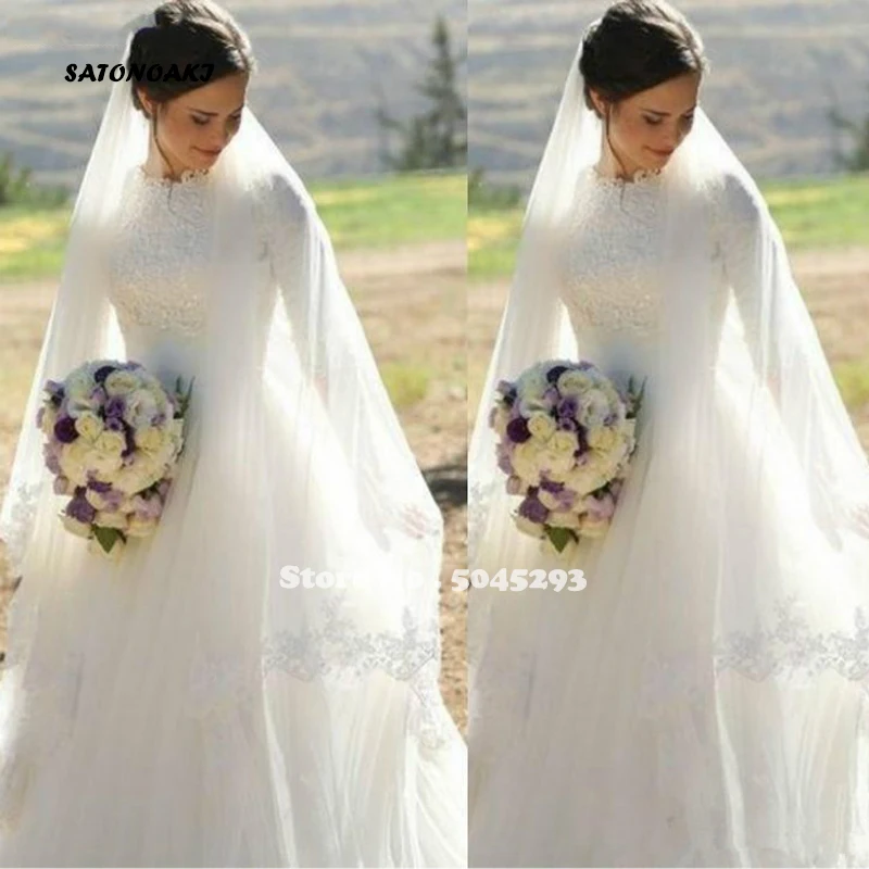Великолепные кружевные мусульманские свадебные платья с длинными ру...