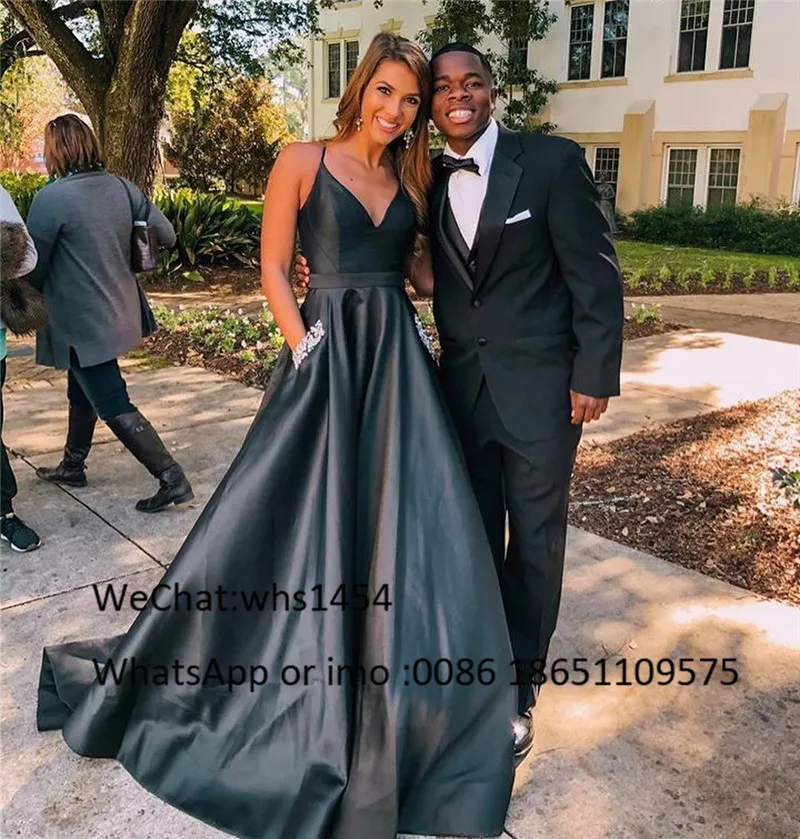 Черное атласное вечернее платье Mbcullyd с V-образным вырезом, Длинное Элегантное формальное платье со шлейфом для выпускного вечера с карманами, 2020