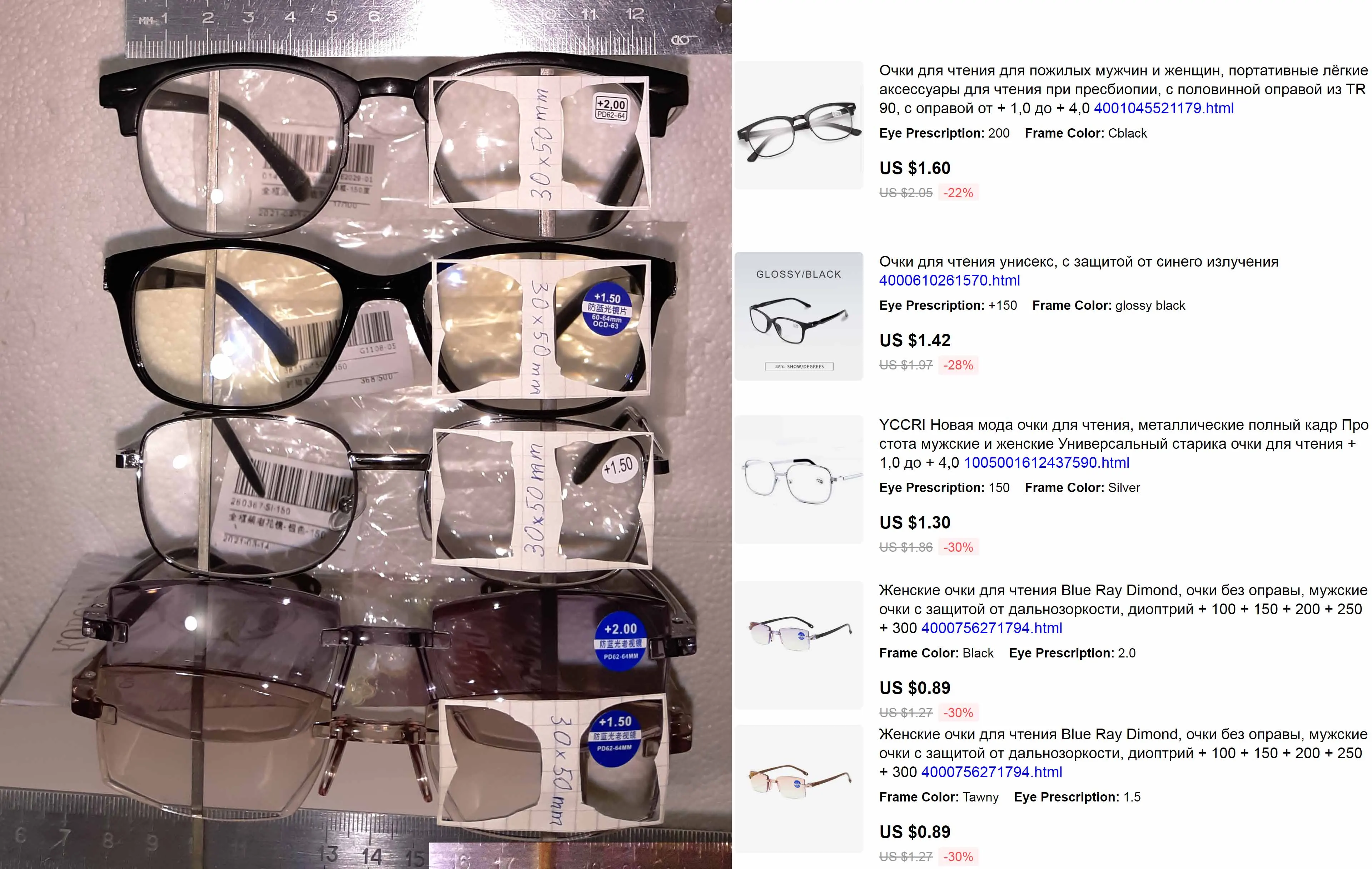 Посылка упакована неважно, но всё доехало сохранным. Вот не думал, что за несколько лет до 50-летия возрастная пресбиопия круто закрутит гайки, и придётся выбирать очки. Выбирал очки с большим полем зрения. Очки $1.61 практичные, минимально давят на нос, но слегка добавляют белую дымку (линзы $1.61 мутнее по сравнению со всеми другими очками). Ощущение, что в жёлтых очках $0.89 наиболее ясно (белой дымки меньше, чем у всех остальных очков). Очки $0.89 тонированы сверху сильнее, чем снизу, их тонировка не мешает в помещении. Неожиданно для меня, лучше всех оказались очки $1.96 (с большими круглыми линзами), их верх на уровне бровей, и взгляд можно максимально перемещать по вертикали не поднимая голову. Очки $1.42 весят 15g. P.S. Пробую сам конвертировать фотки для Ali (чтобы при 3200x2400 каждый jpg был размером < 500 KB, иначе Ali делает их 578x434).