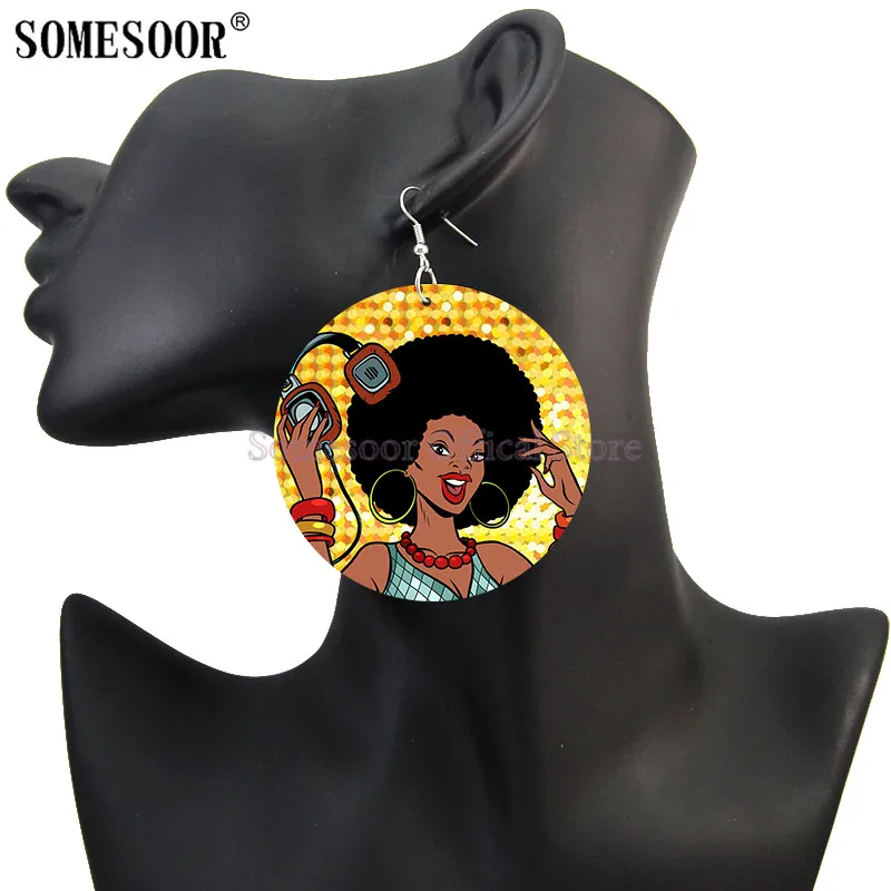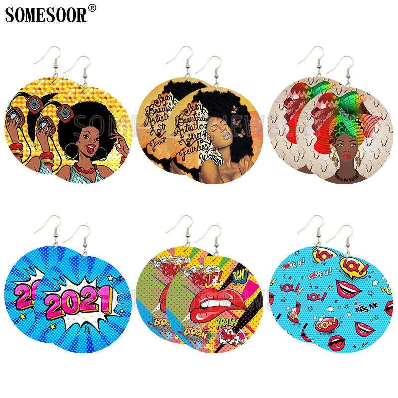 SOMESOOR дизайн 2021 афро Headwarp натуральные волосы черная девушка деревянные висячие серьги комиксы губы LOL искусство печать висячие для женщин подарок