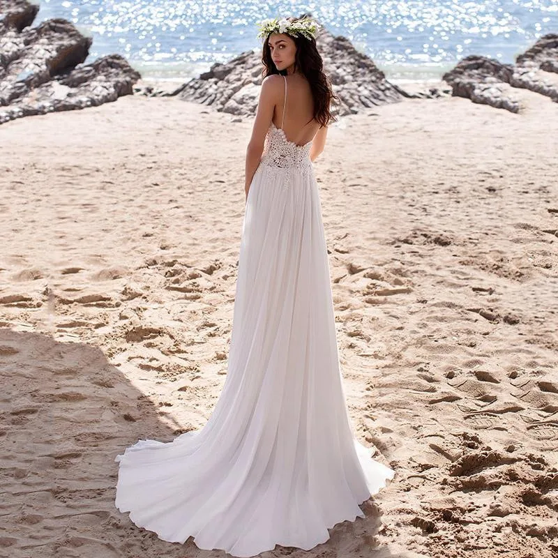 Женское шифоновое вечернее платье, Пляжное летнее платье в стиле бохо, с открытой спиной, на тонких бретелях, с кружевом, в пол, свадебное платье невесты, 2020