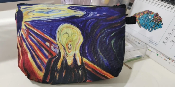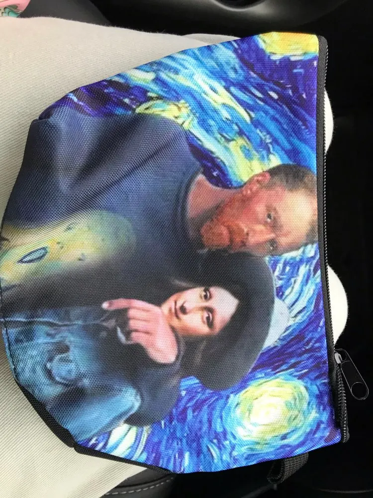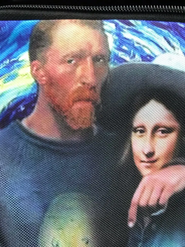 Люблю причудливое изображение на сумке, это забавно! Винсан Ван Гог, обнимая Мону Лизу :) Прибыл очень быстро, всего 2 недели.