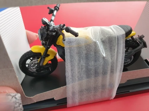 Название: скремблер DucatiБренд: MaistoРазмеры: около 12cmX4.5cmX6.5cmМасштаб: 1:18Материал: литой металл с пластиковыми деталямиУпаковка: Полноцветная оконная коробкаФункция:● Переднее колесо и руль могут качаться из стороны в сторону● Подвижная подставка● Пружинная задняя подвеска● Колеса свободной прокатки
