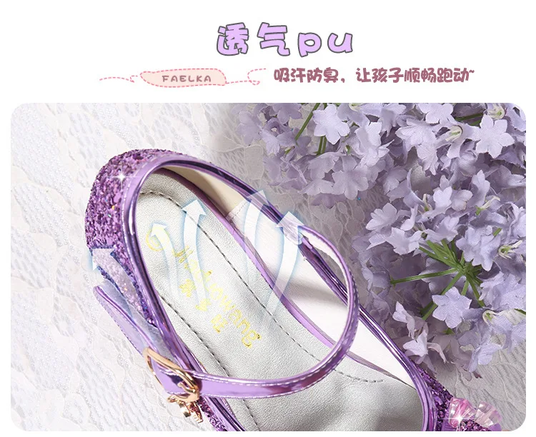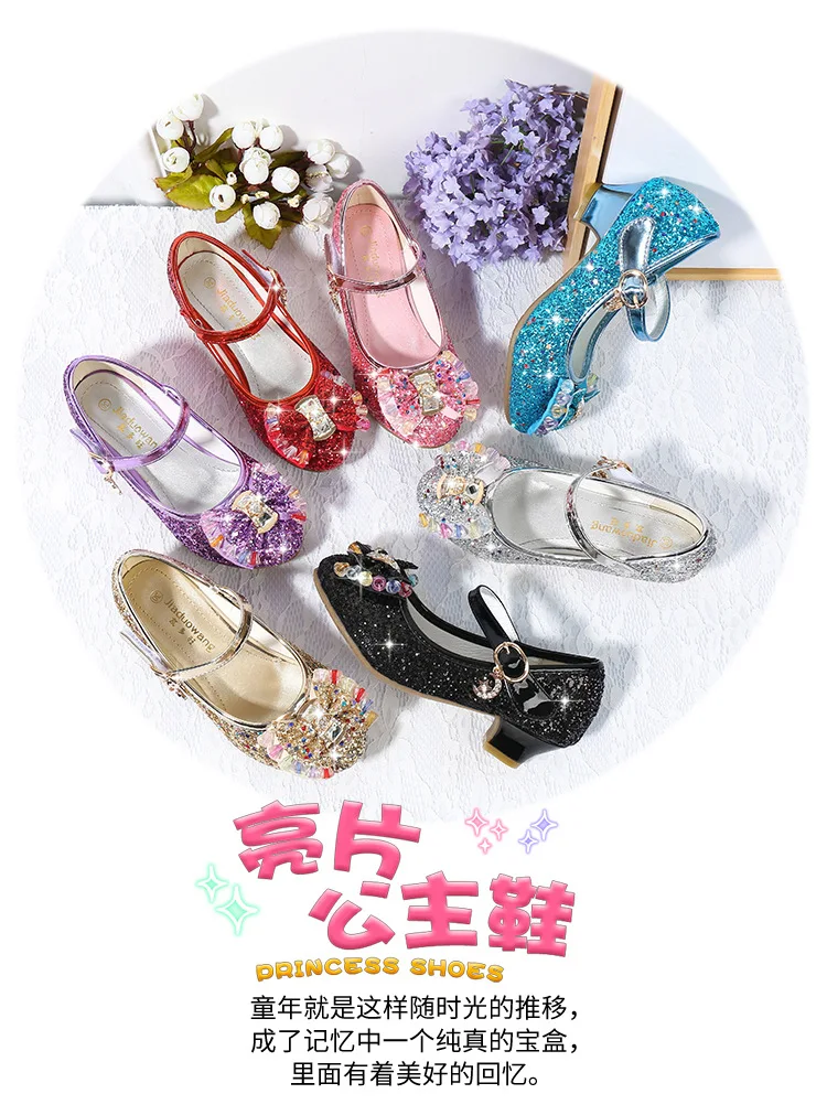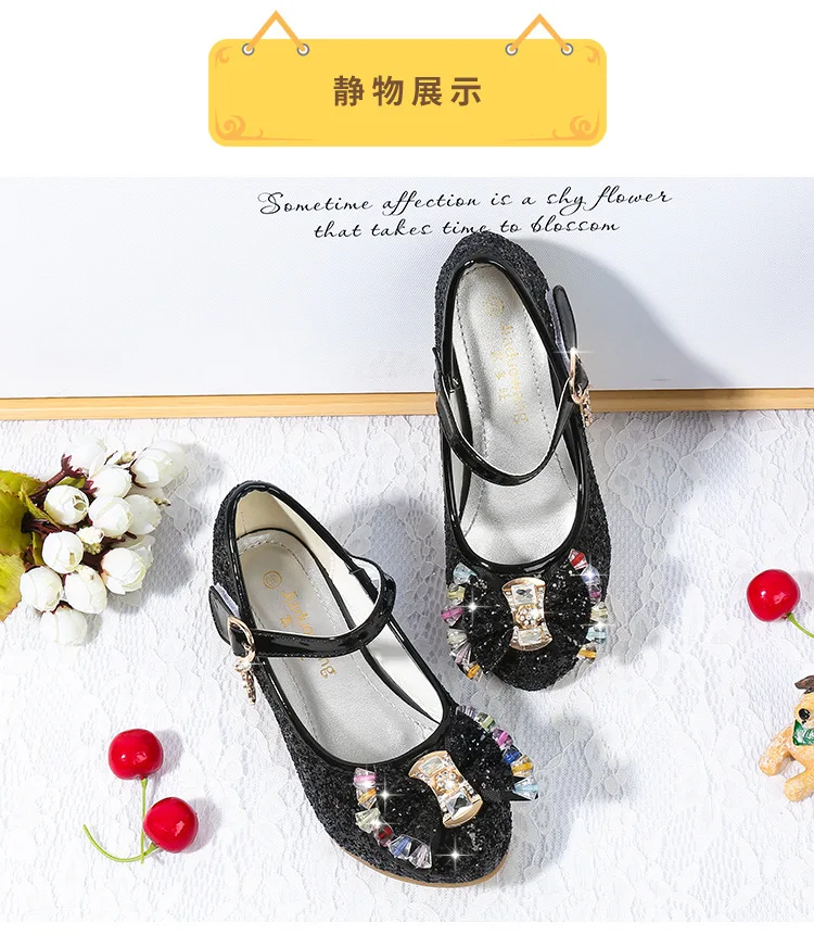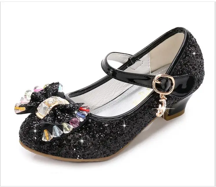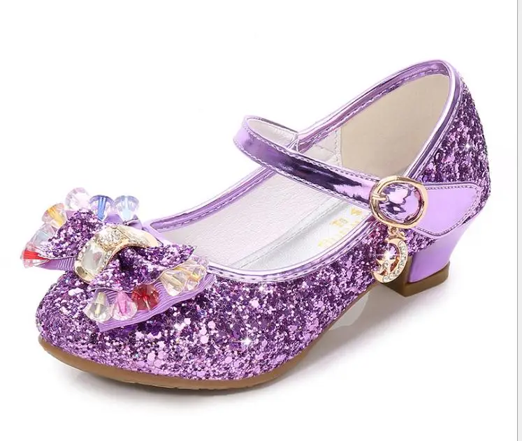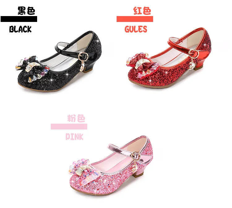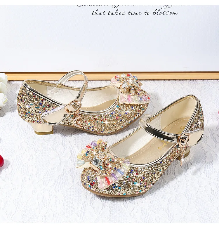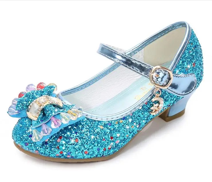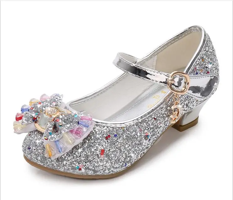 Детские кожаные туфли принцессы для девочек, повседневные блестящие туфли с цветами, на высоком каблуке, с бантом-бабочкой, синие, розовые, серебристые