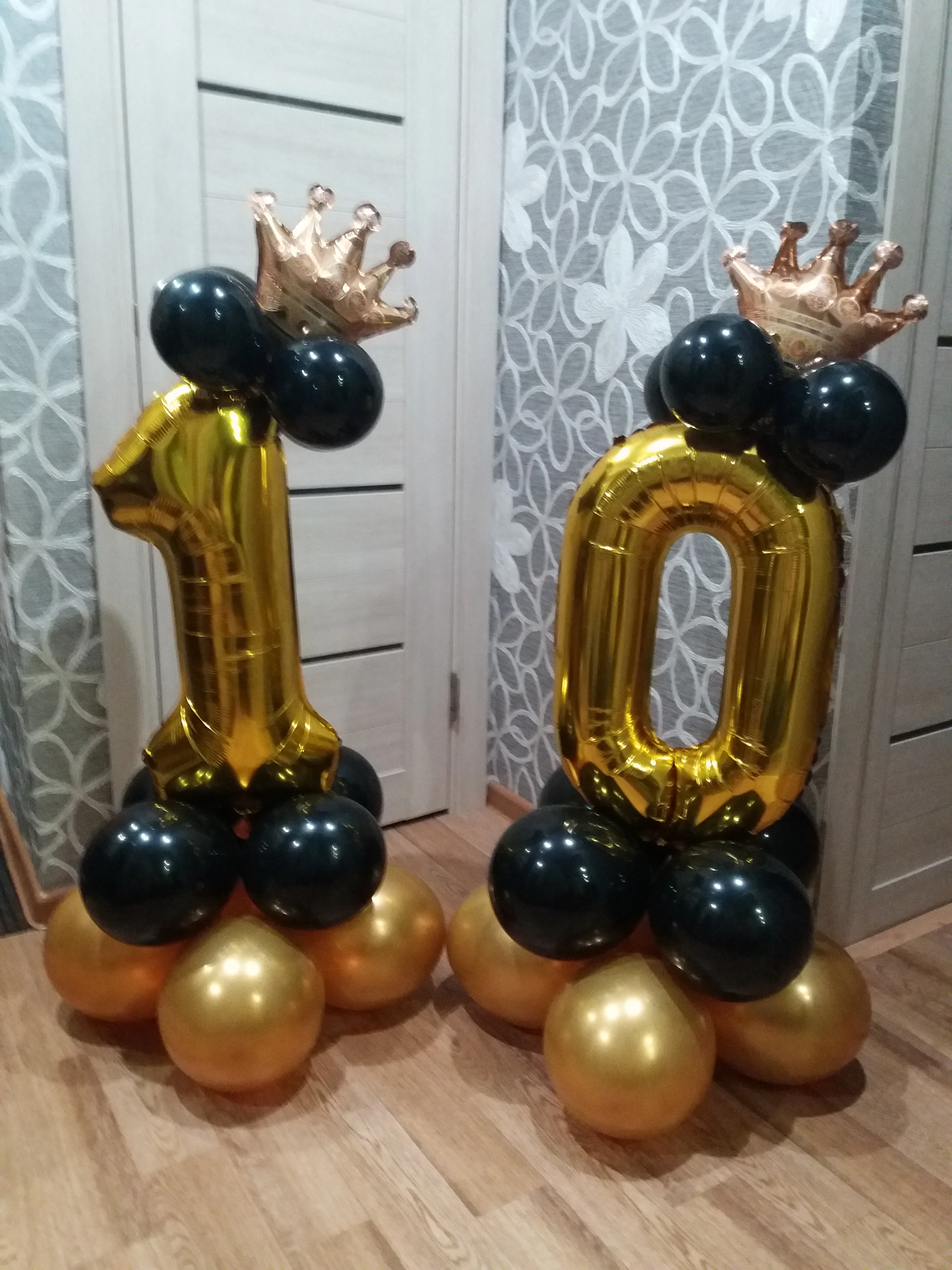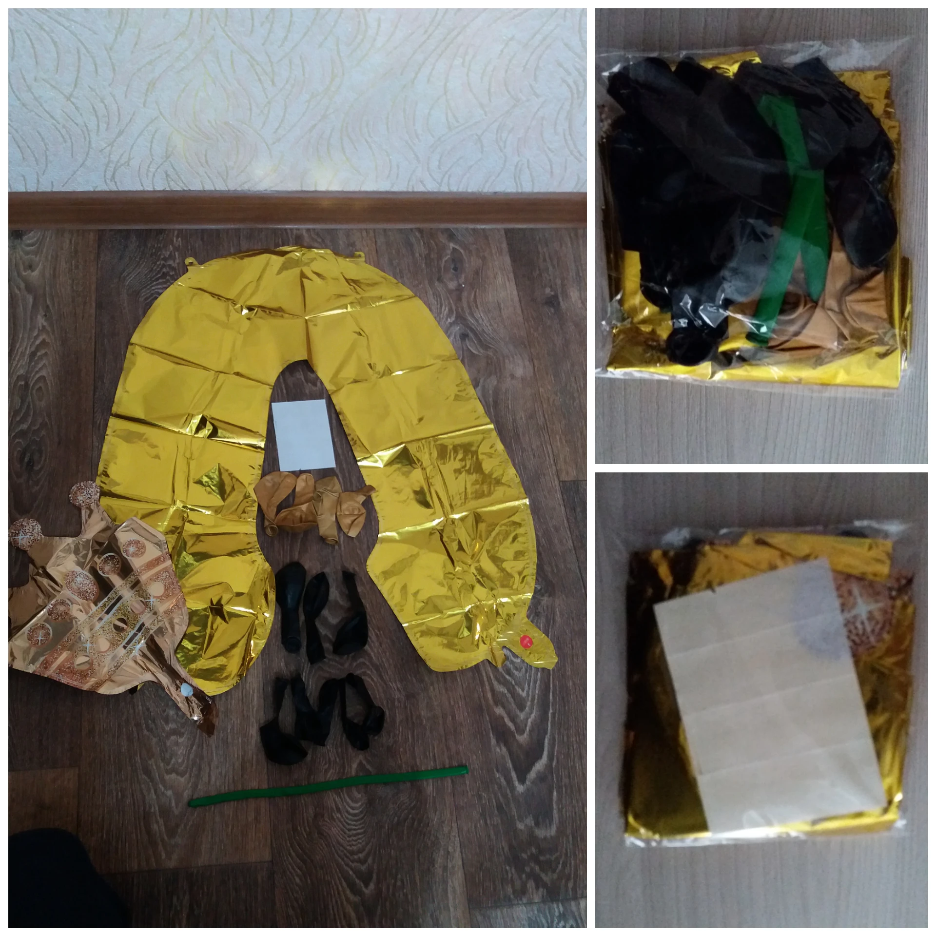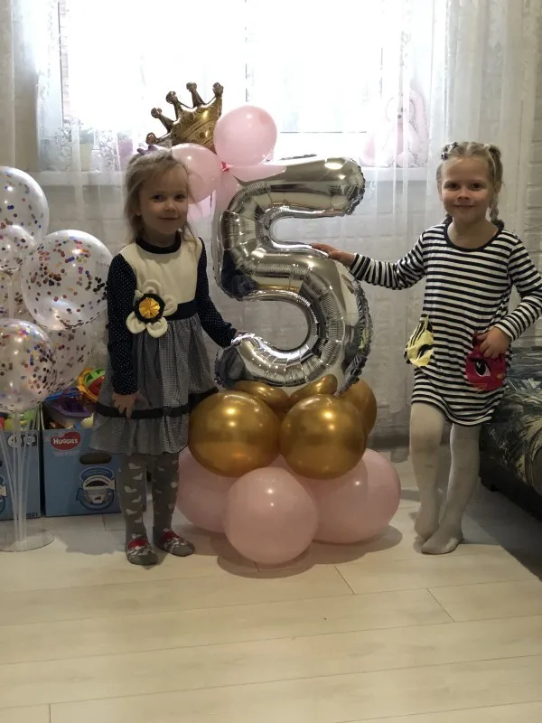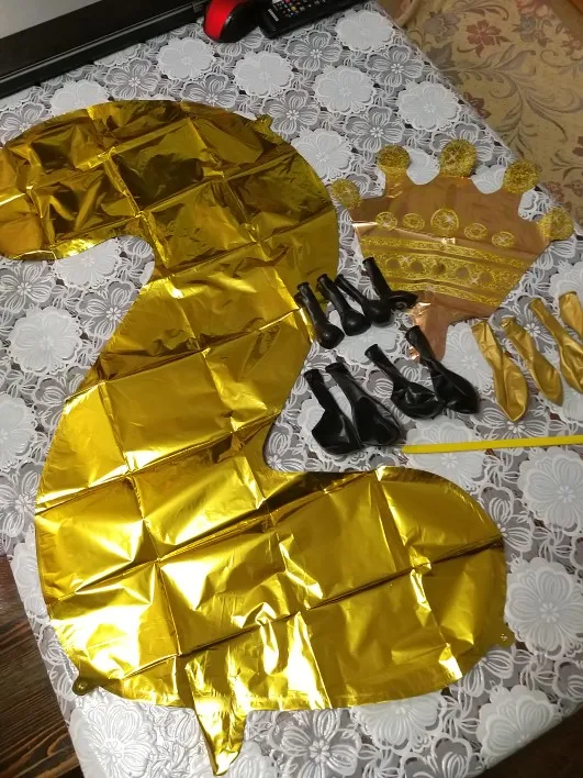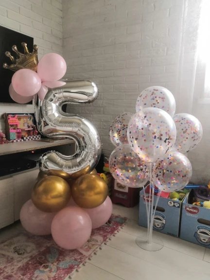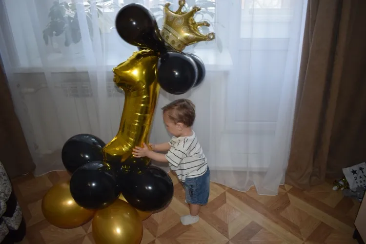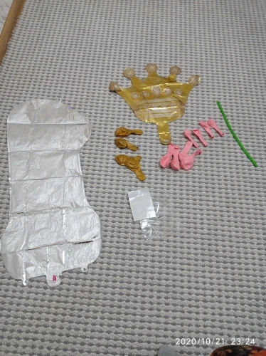 Прислали только один длинный шарик, нижние с единичкой я скрепила, а вот на верхние шары и корону бесполезно потратила время, пытаясь приклеить, в итоге психанула полопала шары и выкинула, оставила "голой" цифру. Был один дополнительный золотой шар. Доставка быстрая, пришло все вовремя.