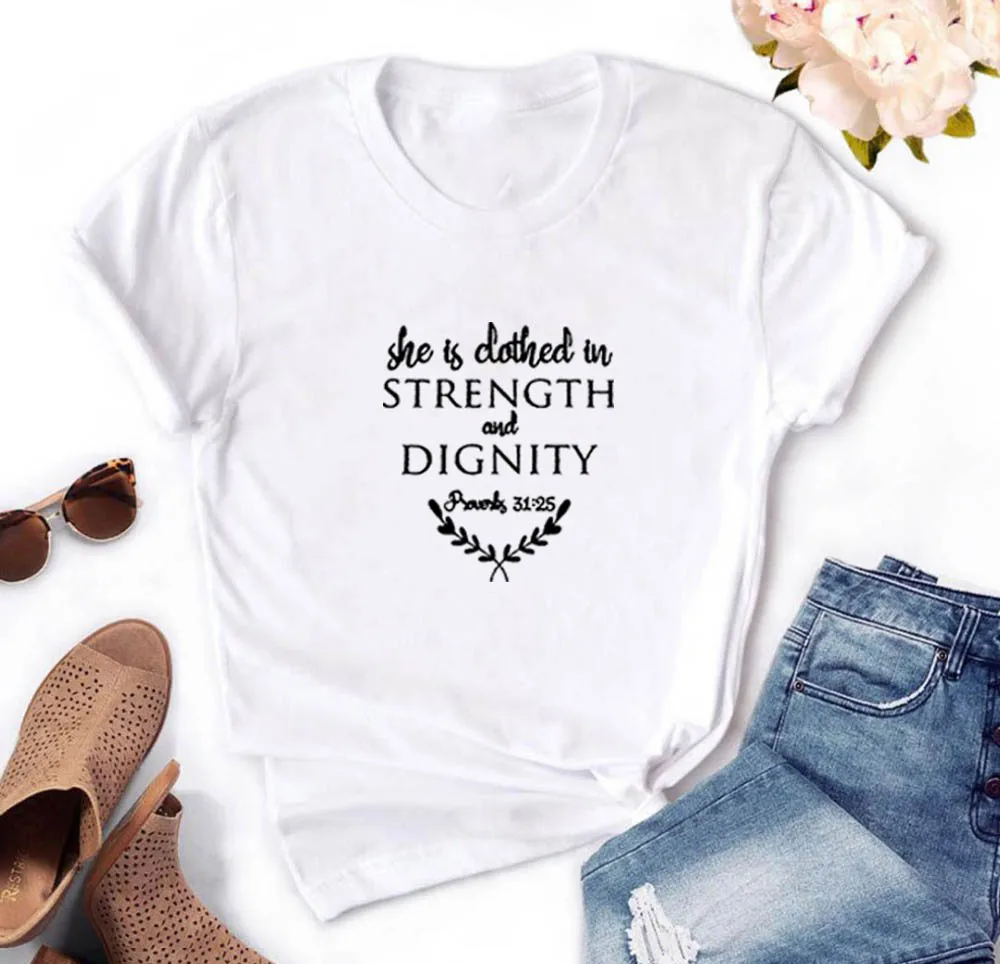 Она одет в силу и достоинство с принтом, женская футболка с О-образным вырезом Изделие из хлопка с короткими рукавами футболка Для женщин свободные футболки Для женщин топы