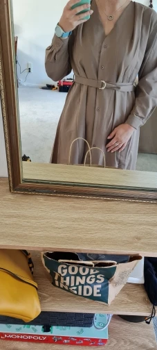 Это очень красивое и удобное, базовое платье, которое вы можете адаптировать в соответствии с днем и полностью изменится. Хорошие, хорошо сшитые пуговицы. Чистые швы. Я не тянул за веревки. Очень мягкая синтетическая ткань из искусственной замши. Более мягкий, розовый цвет, но это больше на мой вкус.