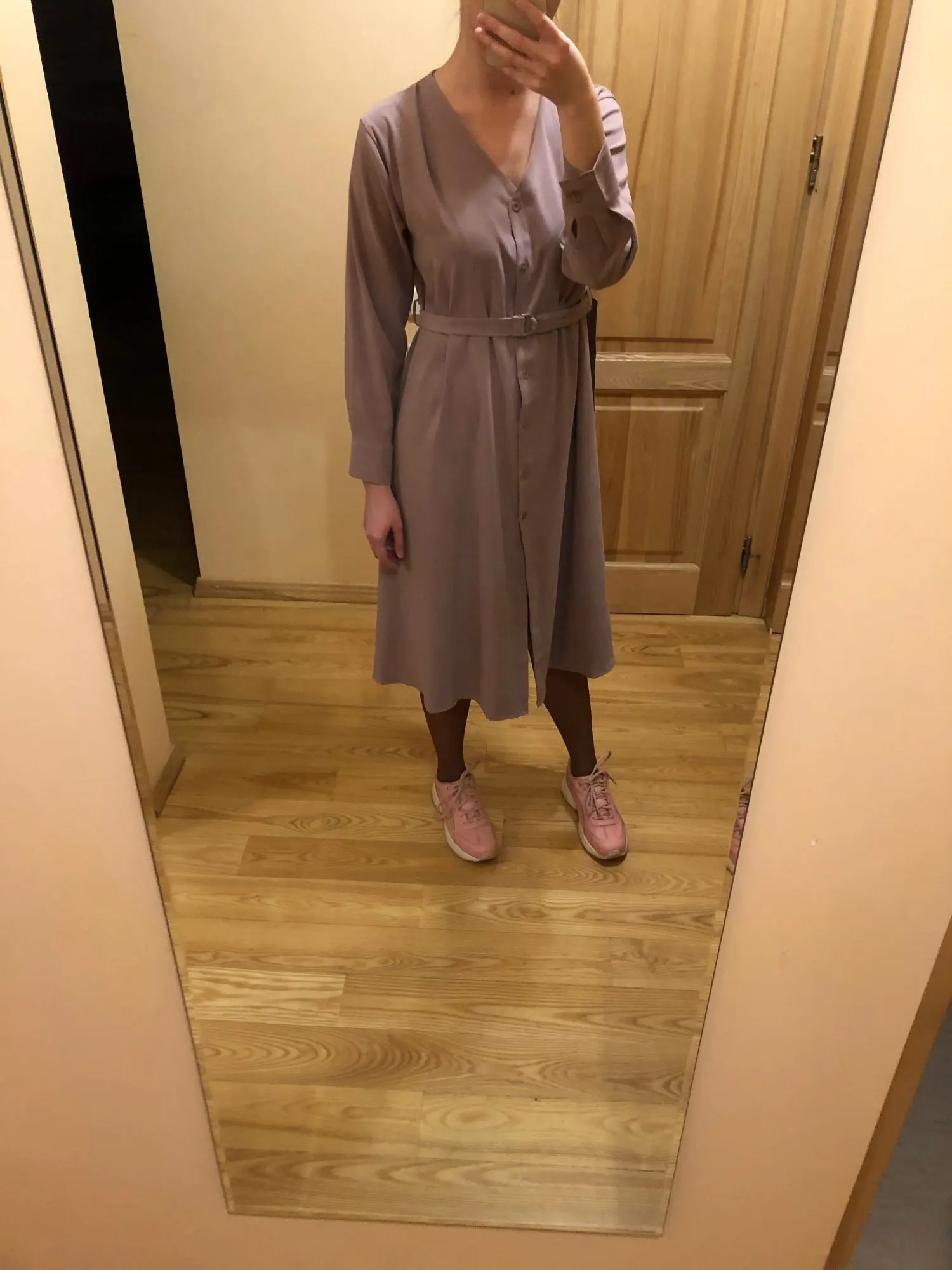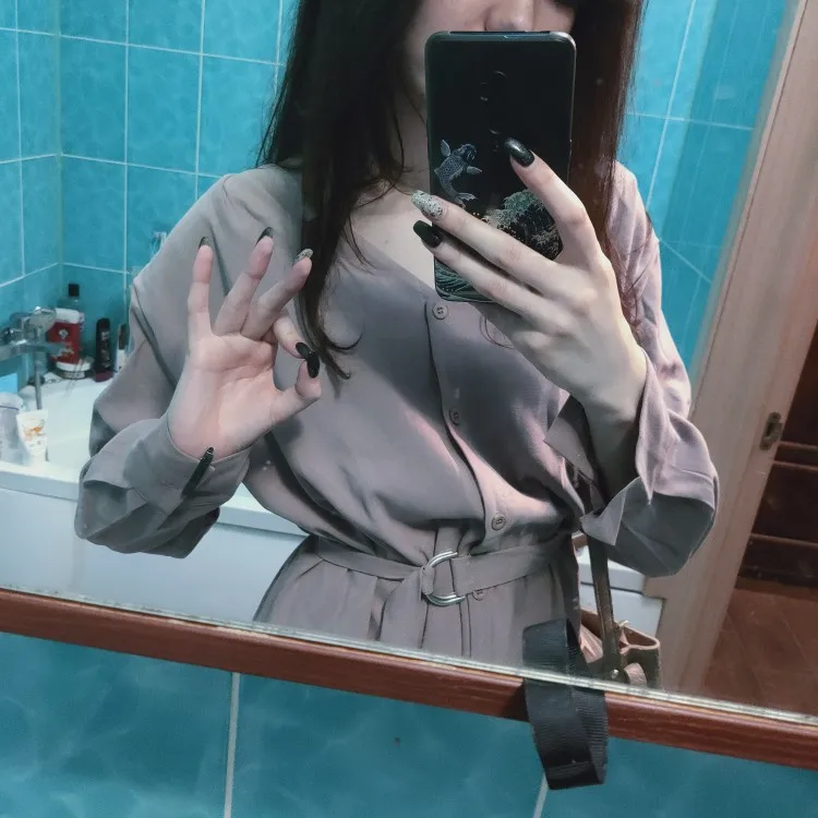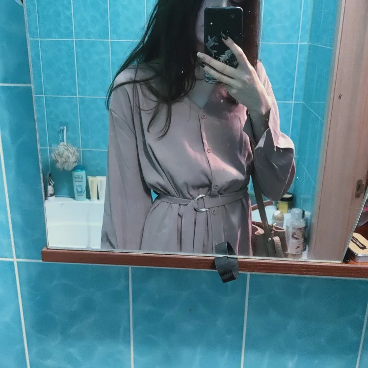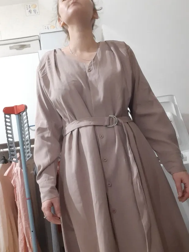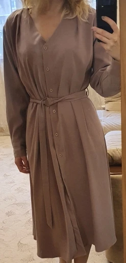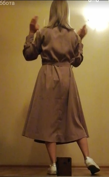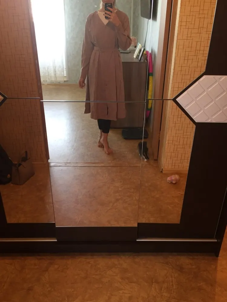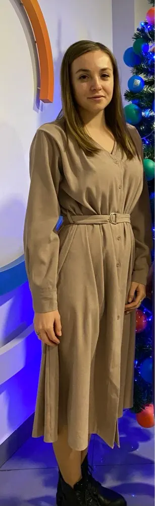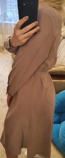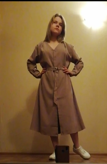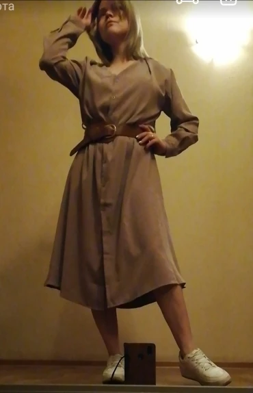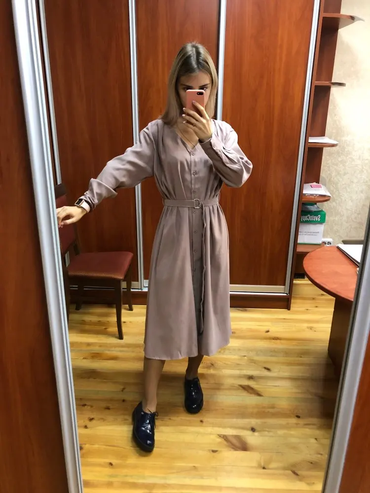 Платье точно такое, как на картинке. Цвет припыленный какао. Но при разном освещении ведёт себя по-разному: то серое, то какао, то проглядывает розовый цвет. Ткань плотная, приятная телу: изнанка гладкая, а верх как будто замша, только нежнее. После стирки высохло моментально: буквально за час-полтора) Стирать лучше с кондиционером - электризоваться не будет) С родным поясом мне не очень понравилось как смотрится, буду носить с ремнями (для примерки использовала первый попавшийся под руку). Плечики как будто не на месте, лучше, если уж размер единый, чтобы крой рукава был со спущенным плечом, но это не так в глаза бросается. Декольте тоже для меня шибко глубокое, но для более пышной груди пойдёт идеально! Длина платья и разрез (пуговки раньше низа заканчиваются) целомудренные, идеально смотрятся на моём росте (1,58). С ремешком садится как нужно, не висит бесформенным чехлом для танка. До Челябинска посылка ехала месяц, на таможне долго висела.