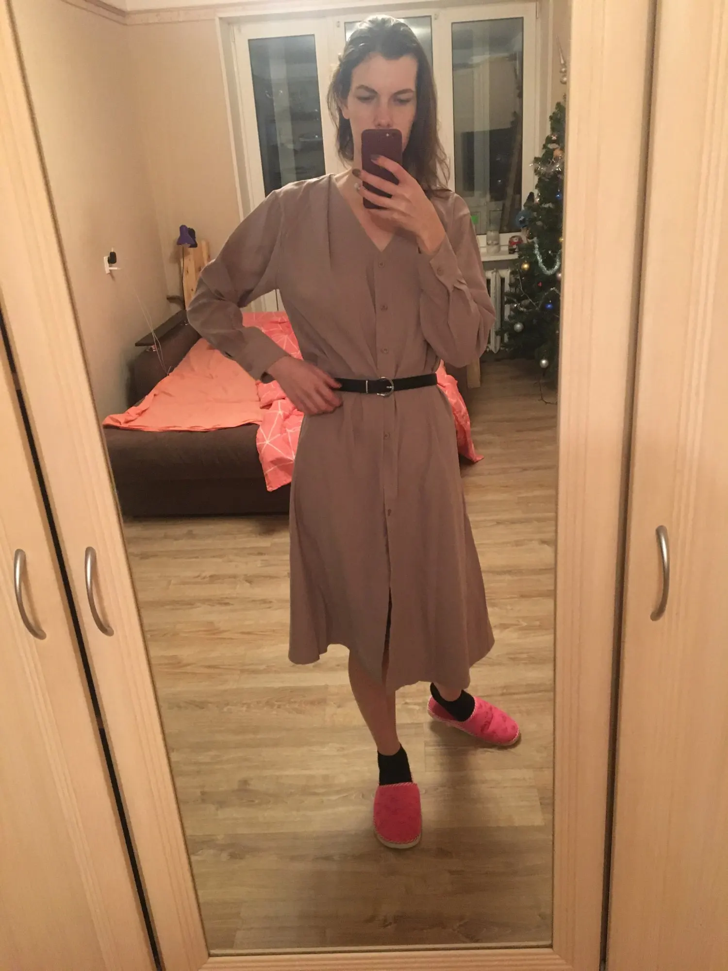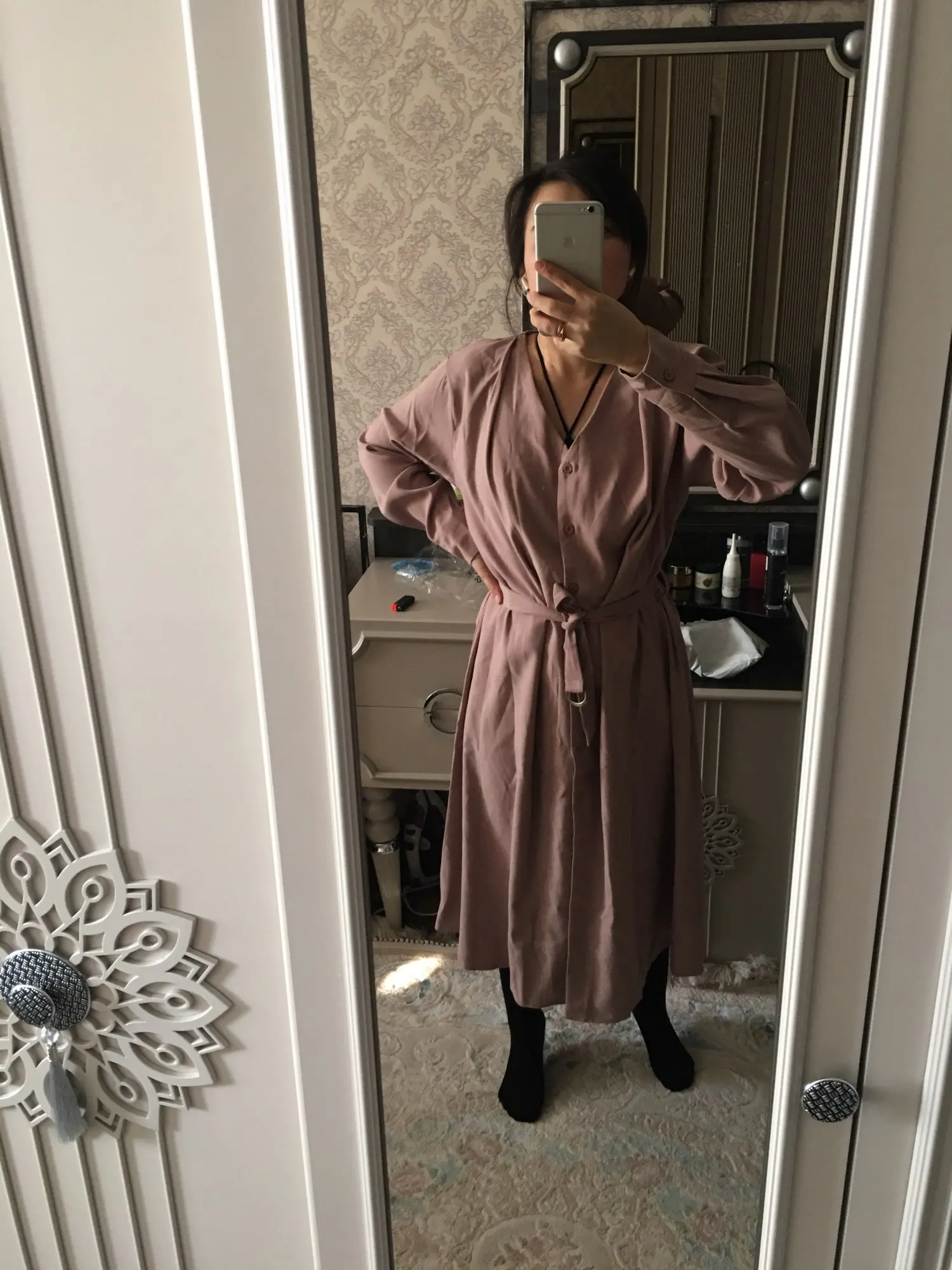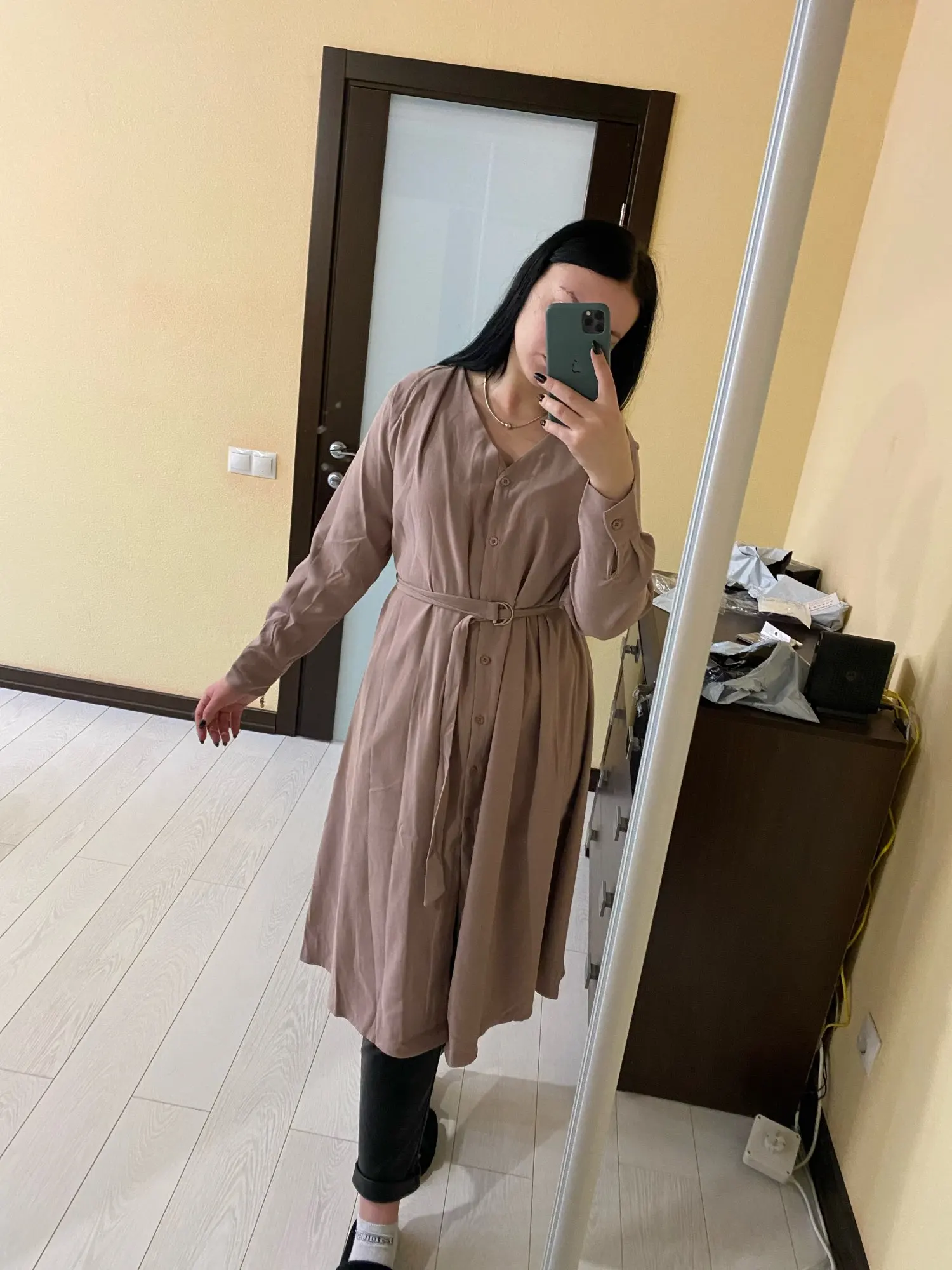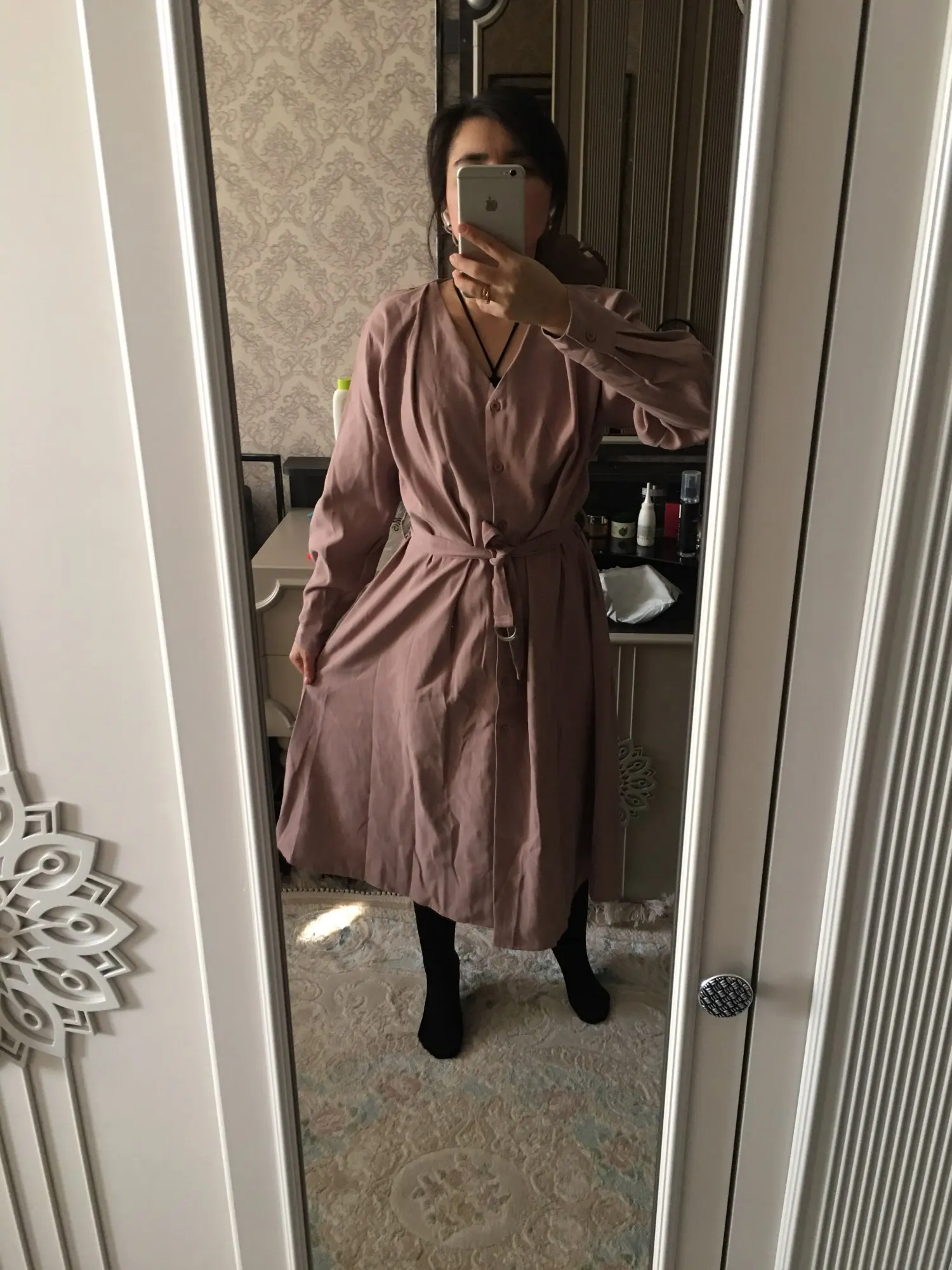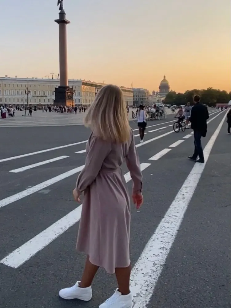 Платье точно такое, как на картинке. Цвет припыленный какао. Но при разном освещении ведёт себя по-разному: то серое, то какао, то проглядывает розовый цвет. Ткань плотная, приятная телу: изнанка гладкая, а верх как будто замша, только нежнее. После стирки высохло моментально: буквально за час-полтора) Стирать лучше с кондиционером - электризоваться не будет) С родным поясом мне не очень понравилось как смотрится, буду носить с ремнями (для примерки использовала первый попавшийся под руку). Плечики как будто не на месте, лучше, если уж размер единый, чтобы крой рукава был со спущенным плечом, но это не так в глаза бросается. Декольте тоже для меня шибко глубокое, но для более пышной груди пойдёт идеально! Длина платья и разрез (пуговки раньше низа заканчиваются) целомудренные, идеально смотрятся на моём росте (1,58). С ремешком садится как нужно, не висит бесформенным чехлом для танка. До Челябинска посылка ехала месяц, на таможне долго висела.