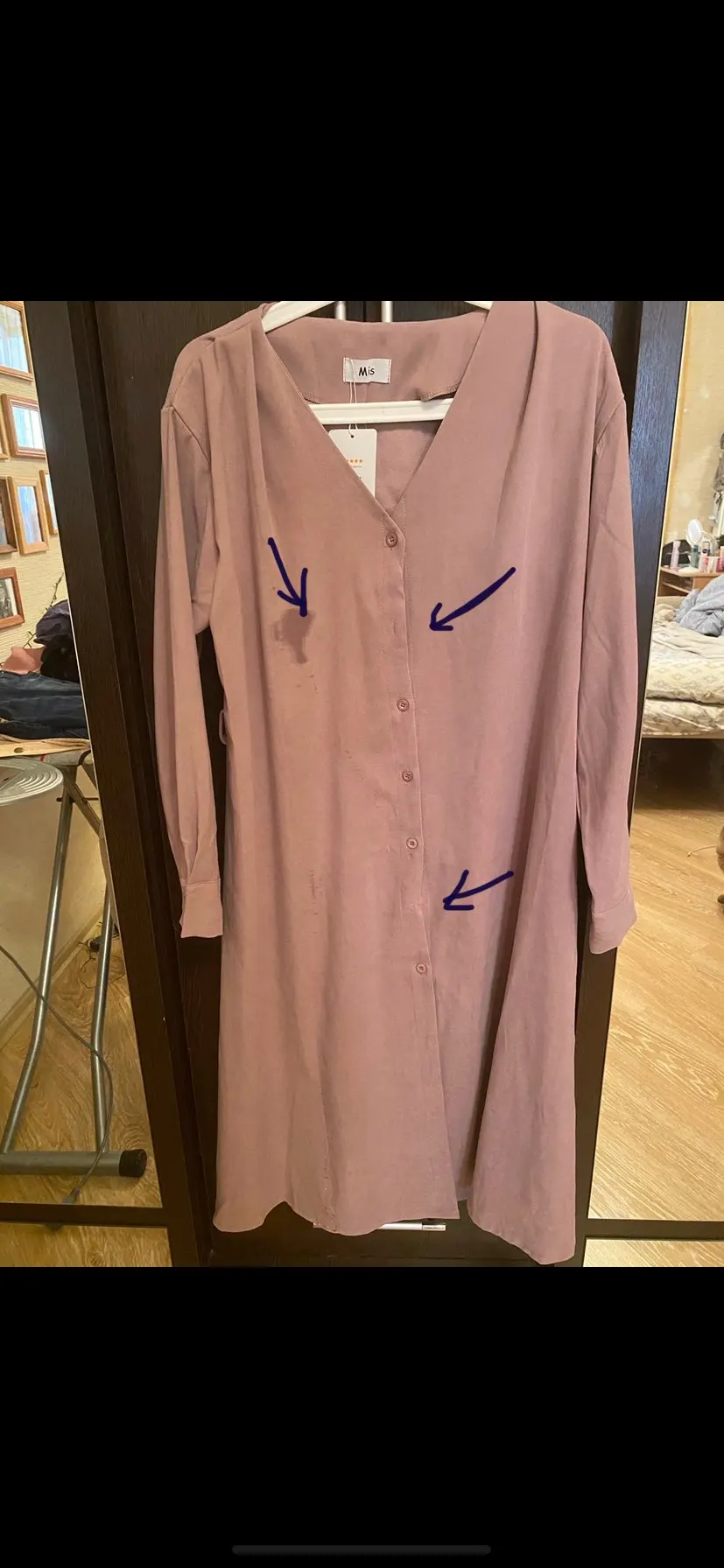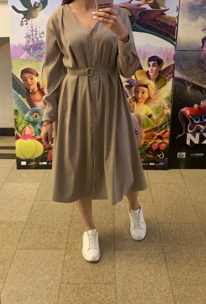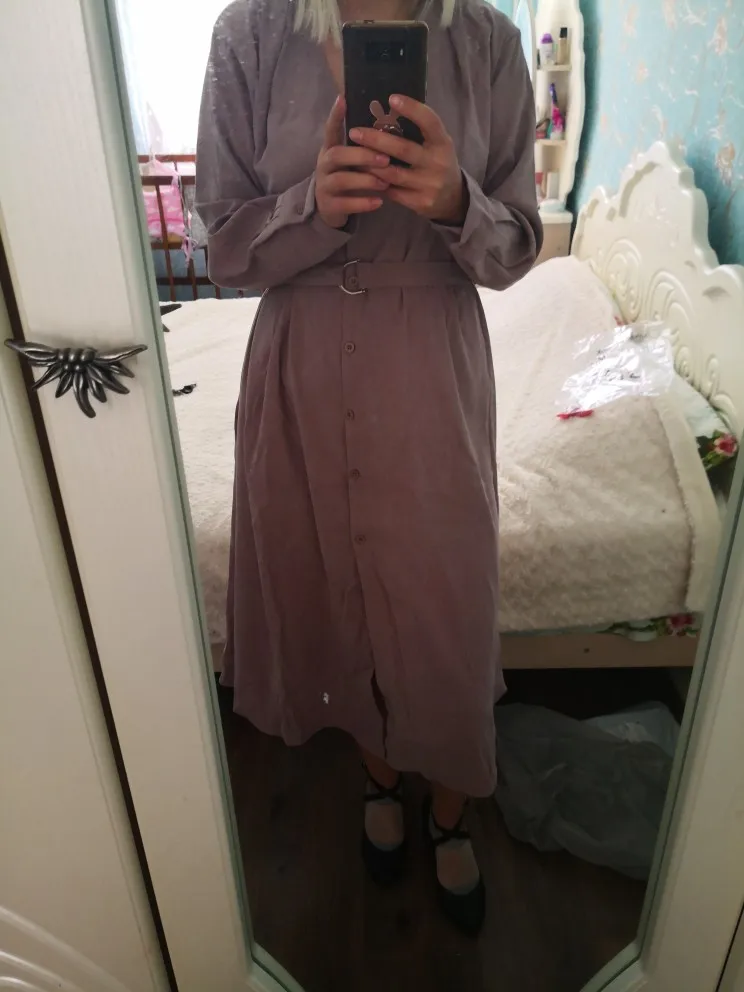 Платье чуть ниже колена, а не по щиколотку. Сильно электризуется ткань. Пуговицы не в цвет. Цвет платья отличается от фото. В общем и целом, разочарована. Ещё и ожидание 47 ДНЕЙ!!!