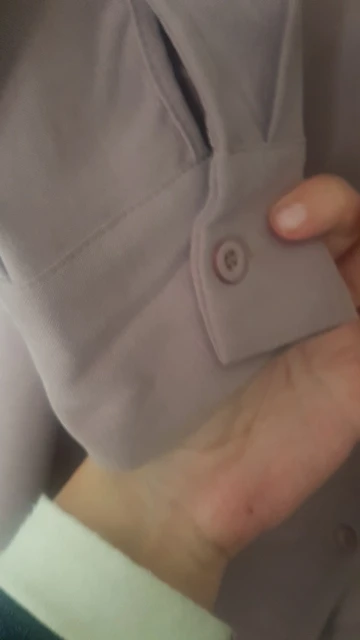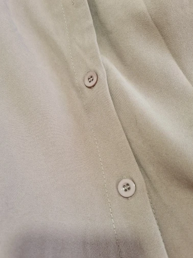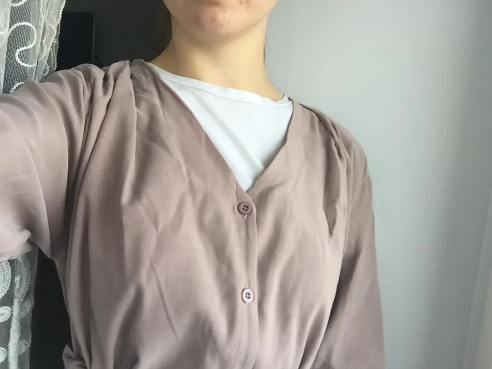 Вроде и всё хорошо, но вот все (ВСЕ!) дырки для пуговиц меньшего размера насколько, что просунуть пуговицы очень очень трудно, а еще эти дырки прошиты почти все очень плохо, торчат нитки... Но в основном, если просунуть пуговицы, то нитки и неидеальность дырок полностью скроются и проблема исчезает. На рост 165-175 идеально. По ощущениям как L, но свободнее. Вырез не вскрывает грудь (размер 85С).