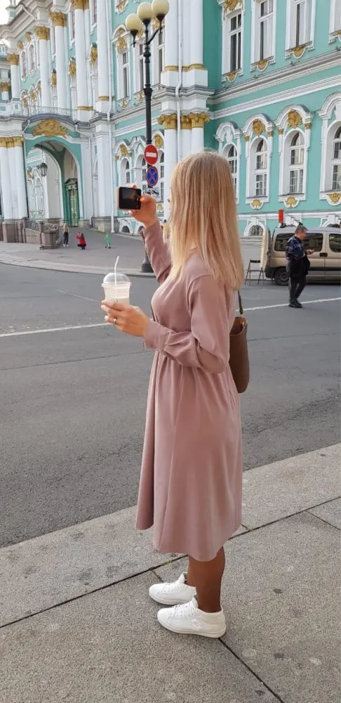Платье прилетело недели за две, самая быстрая доставка. Мне подошло по размеру хорошо. Единственное, цвет отличается от картинки, оно не такое интенсивное, более бледное. Тёмный оттенок, как на фото, конечно, смотрится интереснее. Но в целом неплохо, такое повседневное незатейливое платье из плотной ткани. Не на лето и весну, на прохладную погоду.