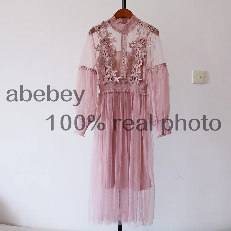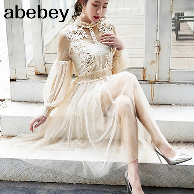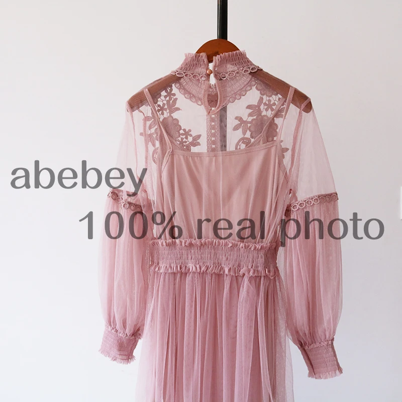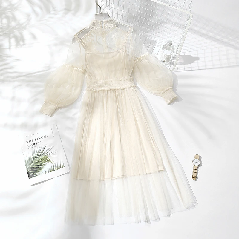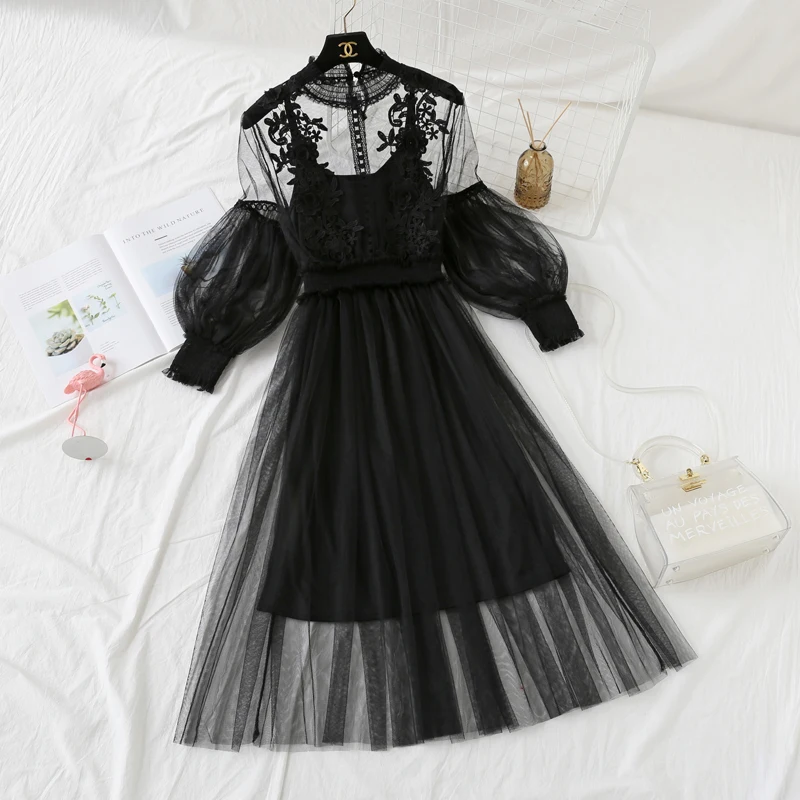 Женское Сетчатое платье с воротником-стойкой, прозрачное кружевное платье с рукавами-фонариками и вышивкой, 2022