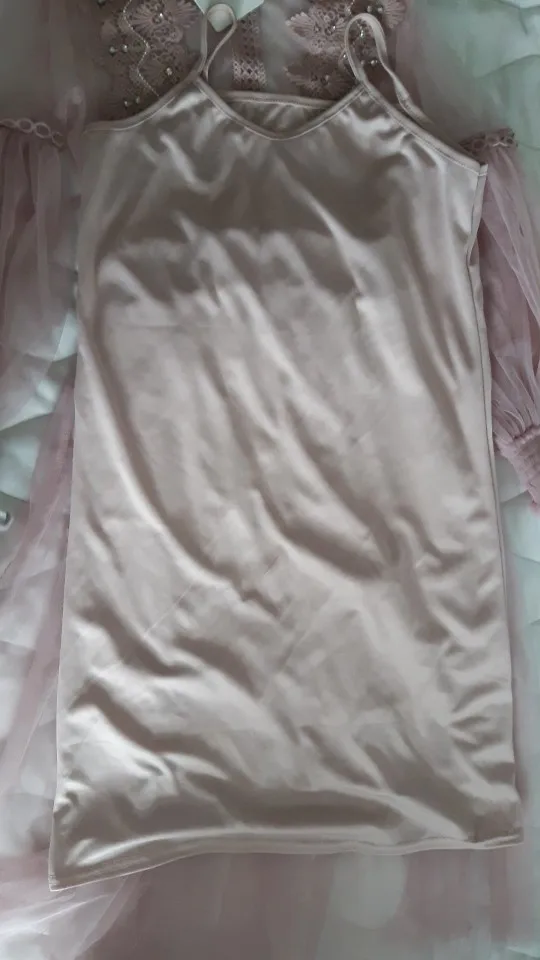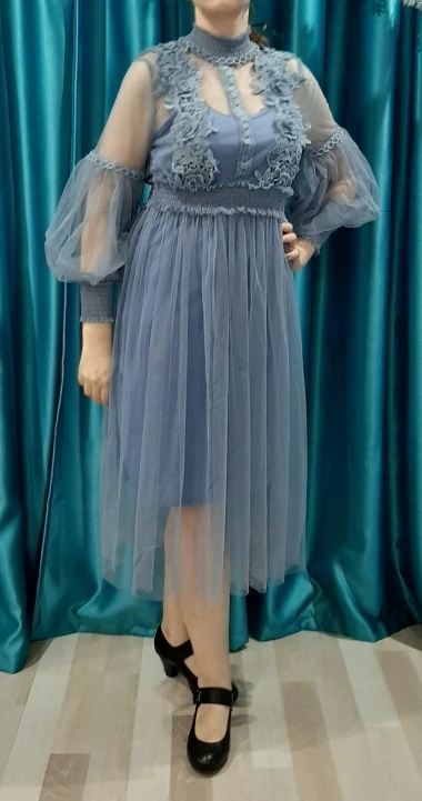 Милое платье, неплохого качества, заказала к нему дополнительно юбку из сетки в качестве подъюбника в тон, т.к. с нижним платьем-комбинацией смотрится совсем бедно. Пока жду подъюбник. На свой 40-42 размер взяла xl, но сидит как s на мне, хотелось посвободнее и повоздушнее. В данном случае цена=качество, я довольна. Доставка быстрая получилась.