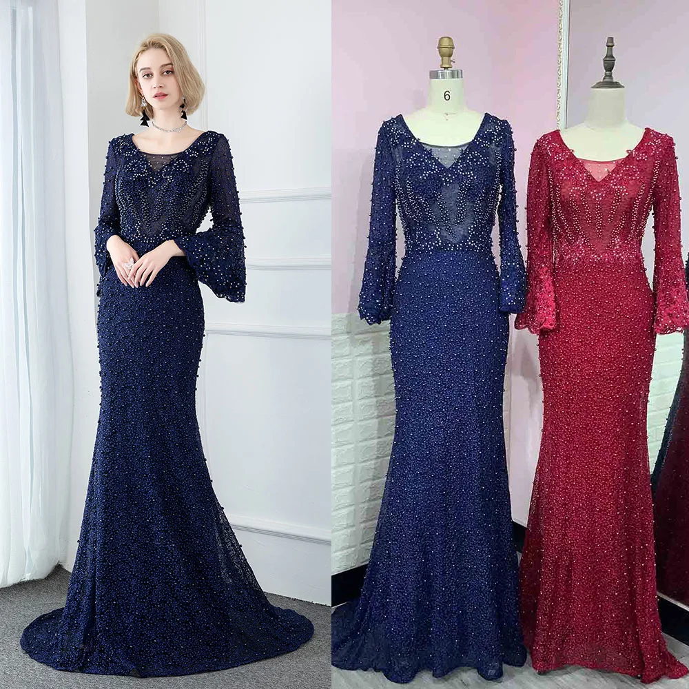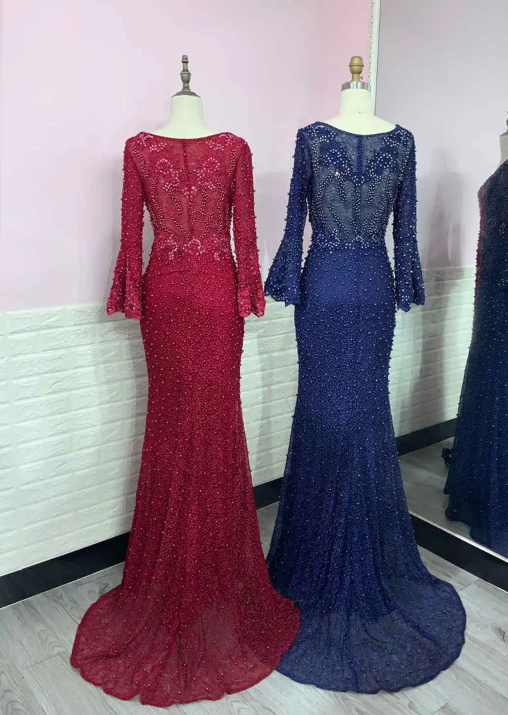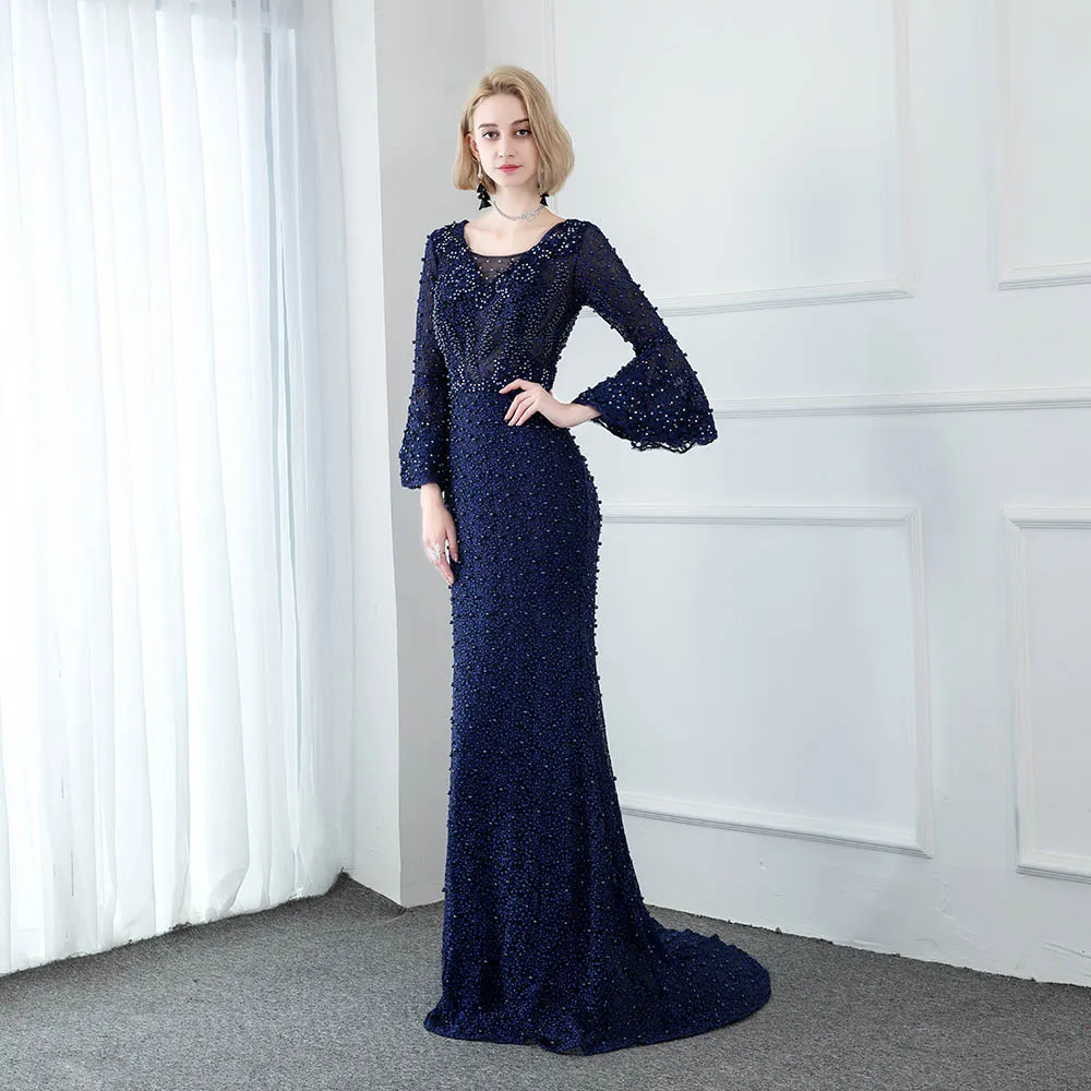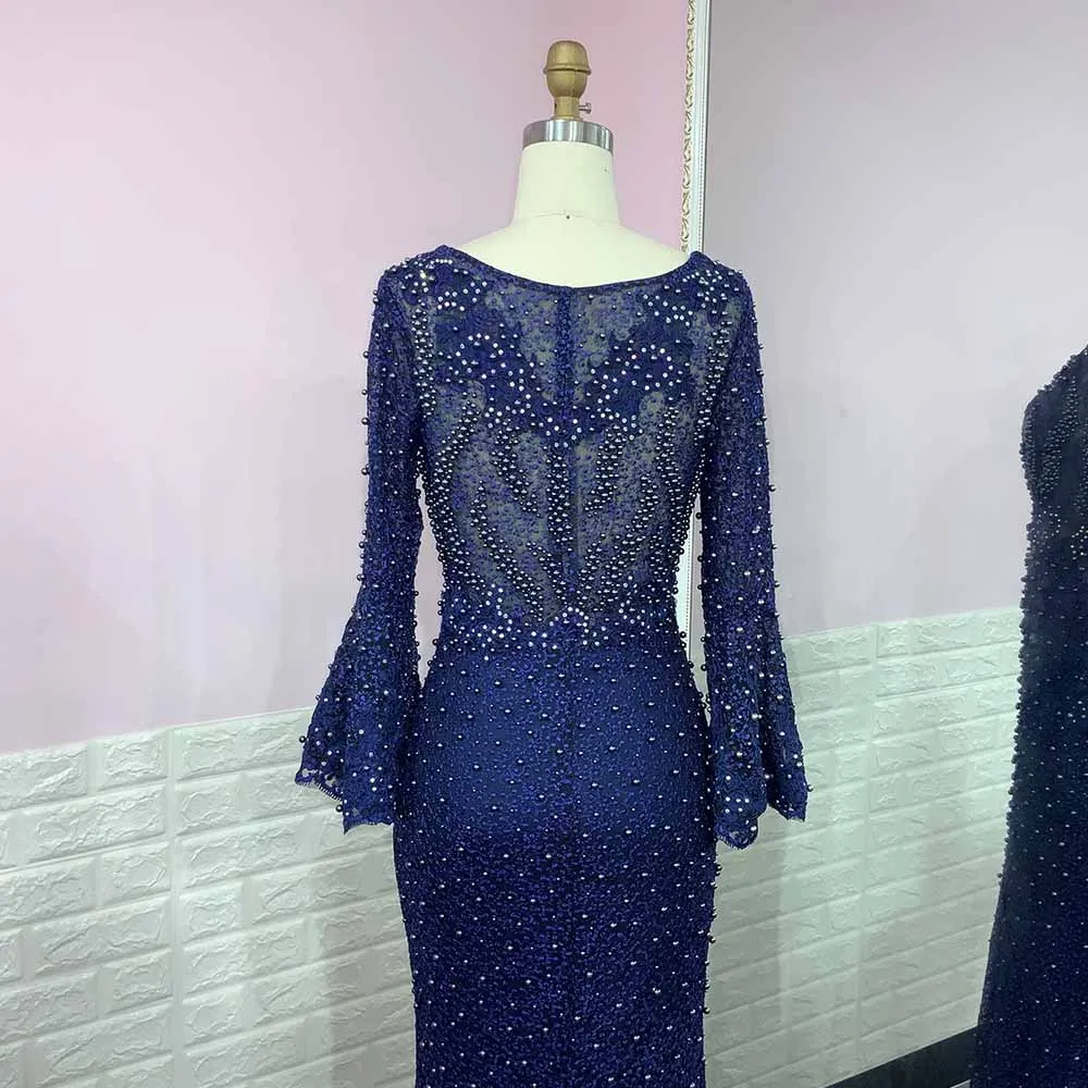 Элегантные мусульманские темно-синие кружевные вечерние платья с длинным рукавом, Кристальные жемчужины, вечернее платье русалки для женщин