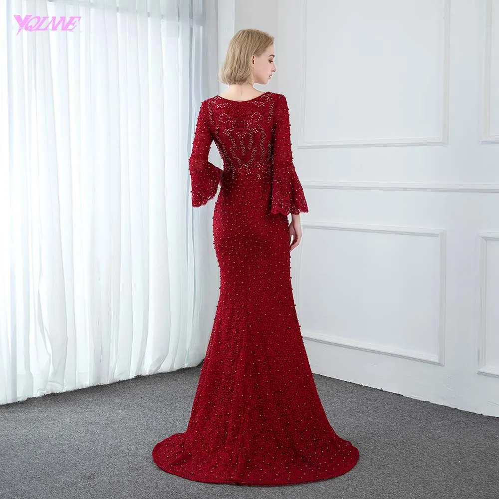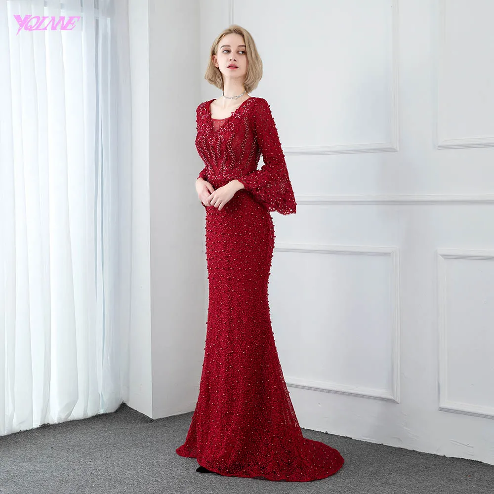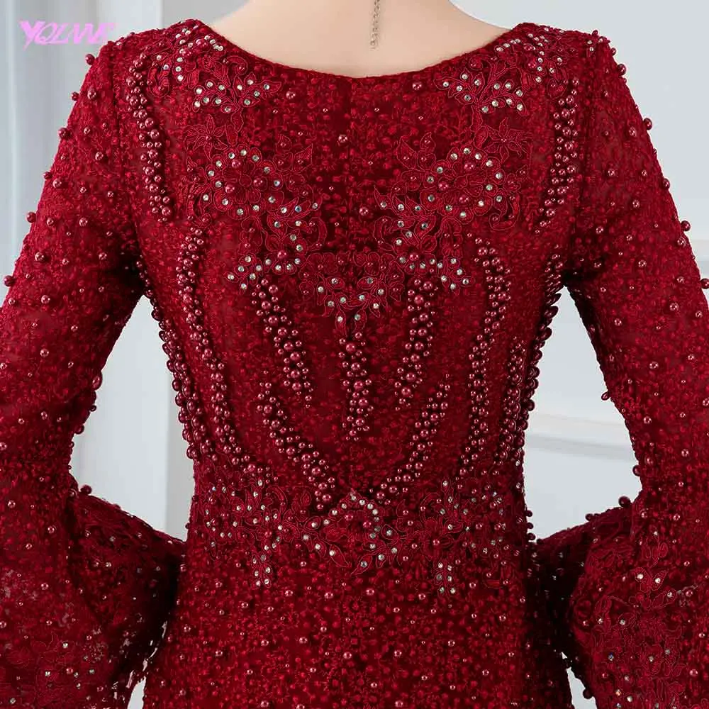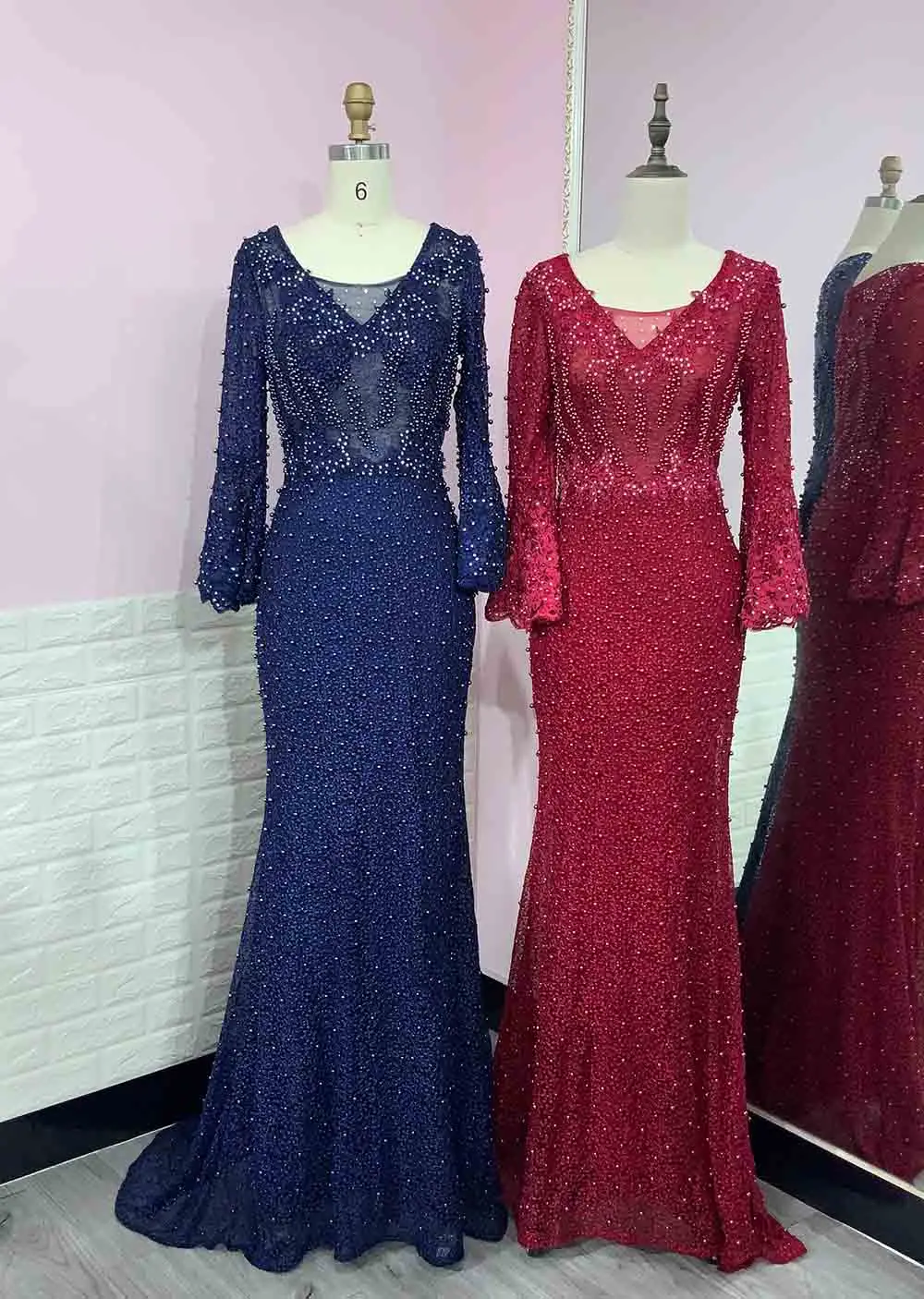 Элегантные мусульманские темно-синие кружевные вечерние платья с длинным рукавом, Кристальные жемчужины, вечернее платье русалки для женщин