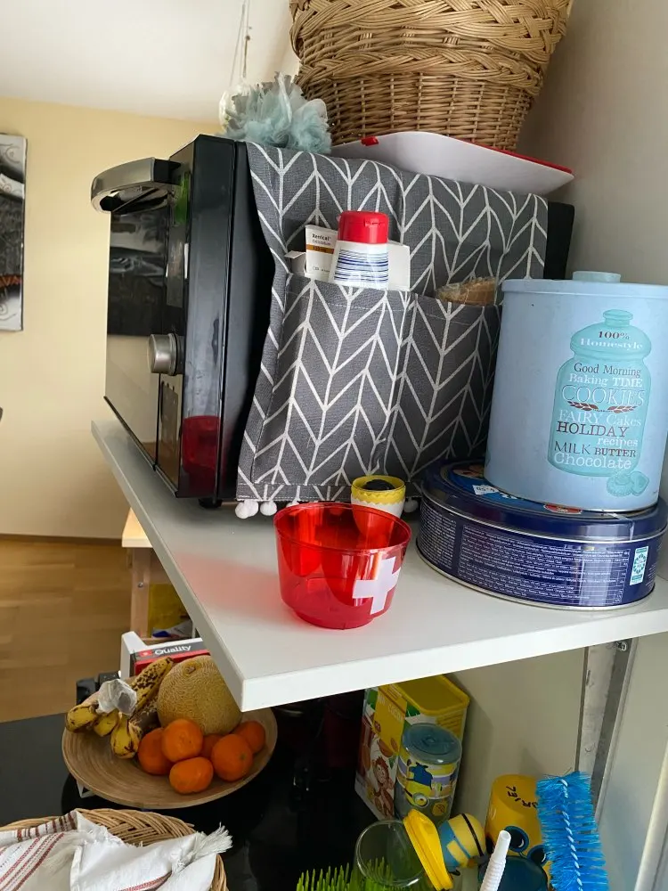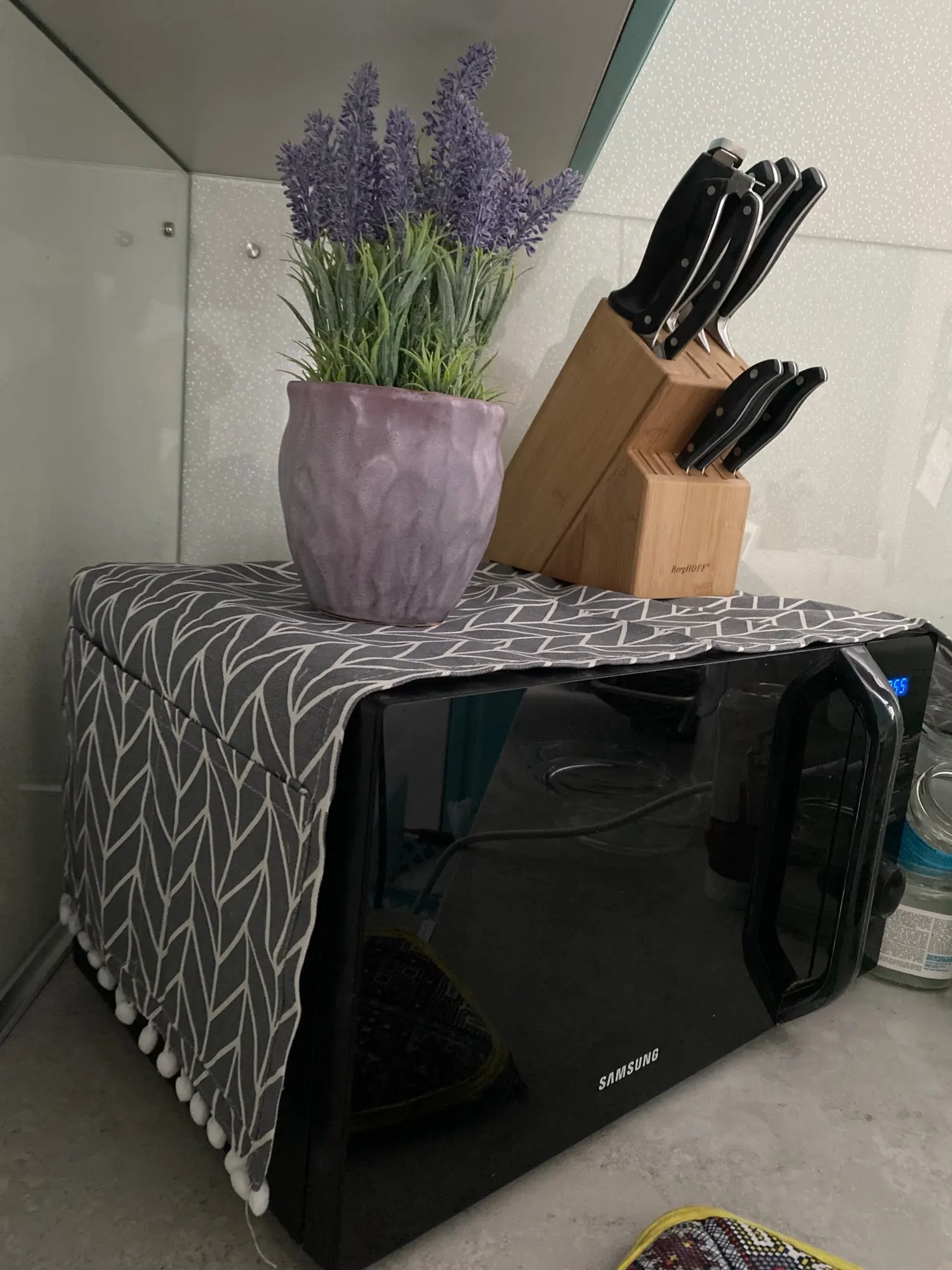 Очень милый. Немного короткий на стандартной микроволновой печи США (стороны почти слишком короткие, где они перекрещиваются на верхние углы), но это только о работе. Может быть слишком мал для микроволновой печи большего размера.