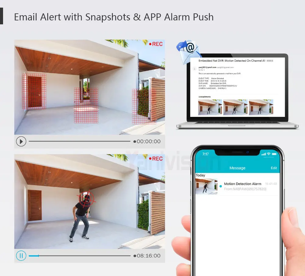 Любое подозрительное движение будет обнаружено камерой и записано одновременно. И вы получите мгновенный сигнал тревоги нажимается через приложение на смартфоне, где бы вы ни находились.