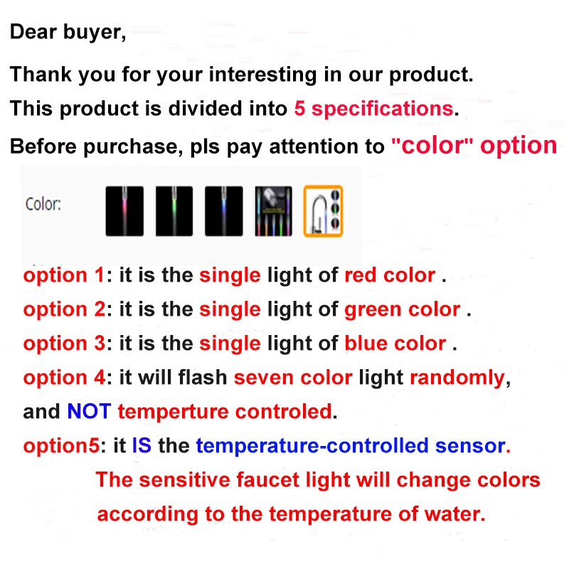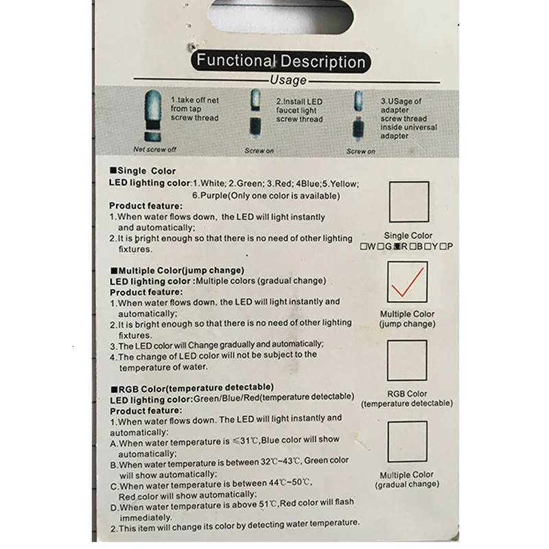 1. Этот продукт имеет мини-Встроенные генераторы электроэнергии устройства, нет необходимости в батареях, до тех пор, пока поток воды будет выдавать свет, выключить воду, свет гаснет немедленно.