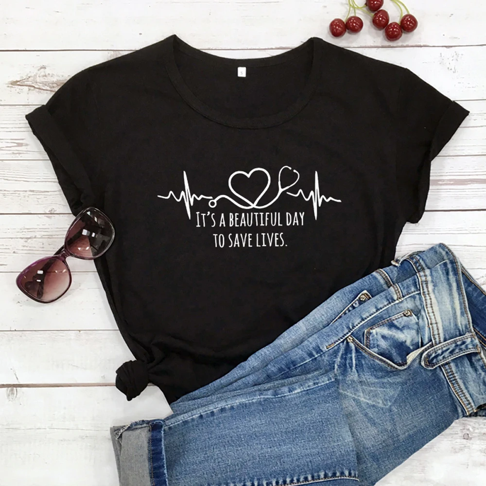 Футболка женская в стиле 90-х с рисунком сердцебиения и надписью It's A Beautiful Day To Save Lives