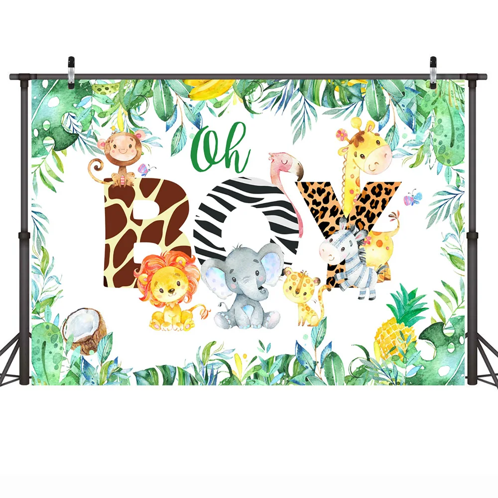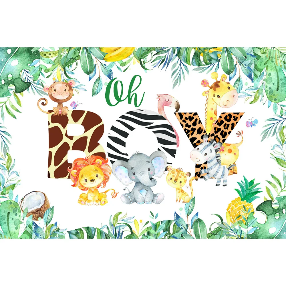 Фон для фотосъемки новорожденных с изображением животных и листьев леса и кокоса Oh Boy для вечеринки в стиле сафари