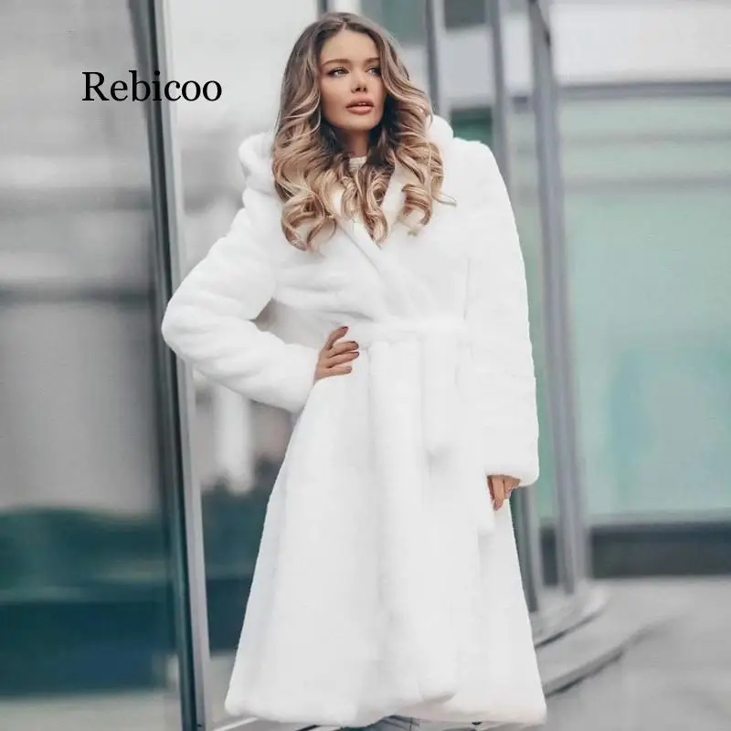Женское длинное зимнее пальто с капюшоном, белое пальто из натурального меха кролика Рекс, модная Роскошная куртка из натурального меха