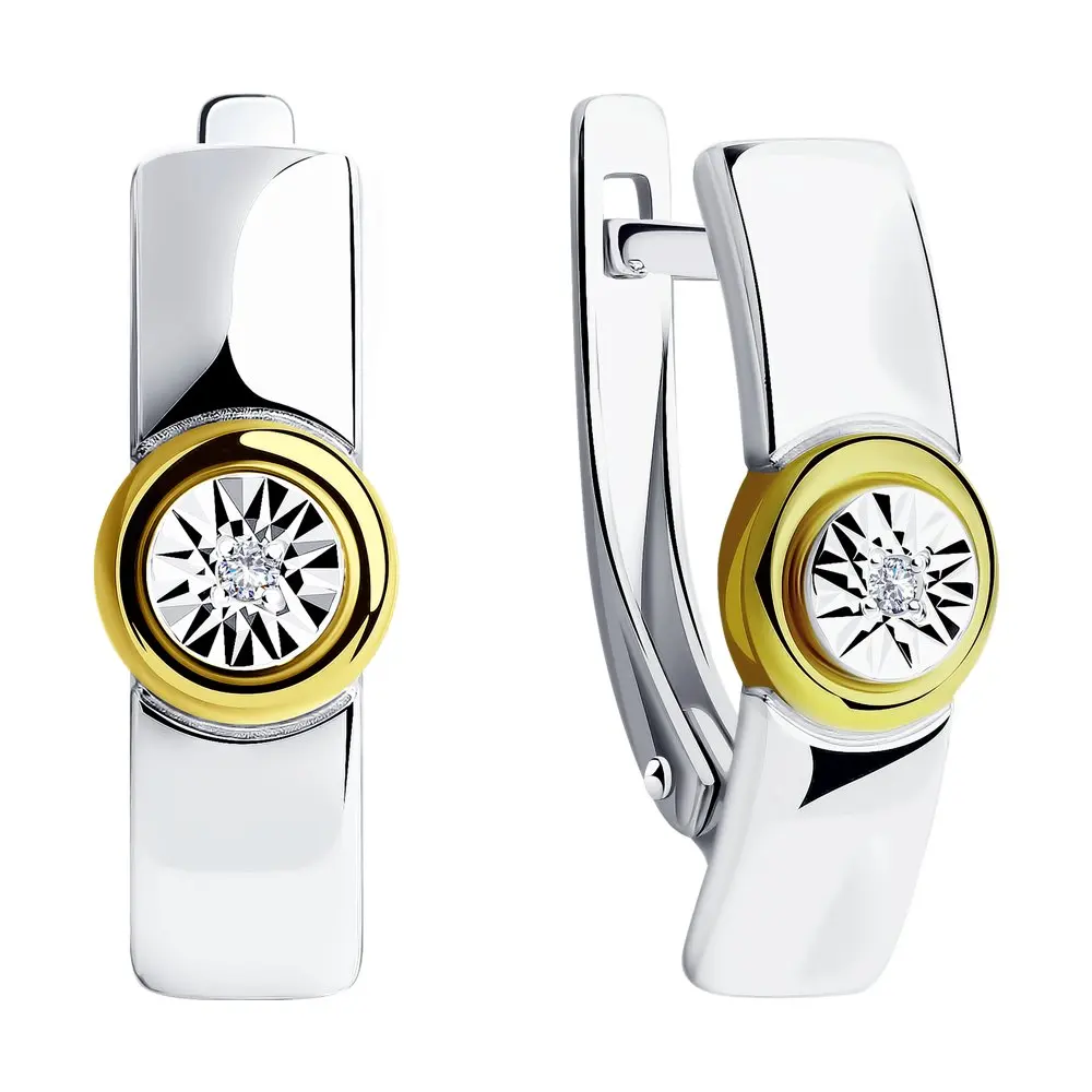 Серьги SOKOLOV из золочёного серебра с бриллиантамиЭлегантные серебряные серьги с бриллиантами – пример того, как современная классика легко вписывается в тренды. В этой модели дизайнеры отдали честь модному минимализму и гармонии геометрических форм. Другая особенность – эффектный контраст металла тёплого и холодного оттенков. Рельефный каст акцентирует бриллиант и визуально его увеличивает. Благодаря лаконичному дизайну украшение окажется уместным в любом образе.