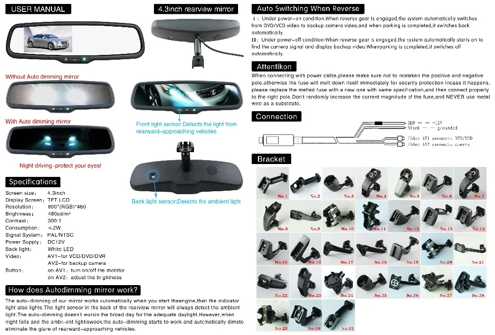 Содержимое упаковки: 1 x Монитор автомобильного зеркала заднего вида 1 x кронштейн 1 x видеокабель и кабель питания 1 x Бонусная крышка провода 1 x Руководство пользователя на английском языке