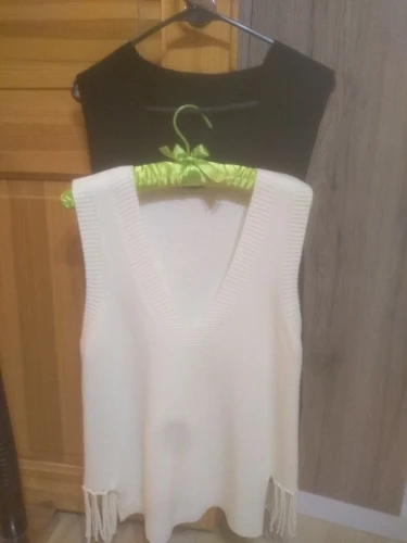 Тонкий трикотаж, просто сшиты две половинки, нитки торчат. Выглядит очень дешево. Брала размер XL на свои 90-62-90. Сидит впритык, никакой свободы, глубины проймы не хватает, Никакую рубашку пододеть не получится, только тоненькую плотно прилегающую водолазку.