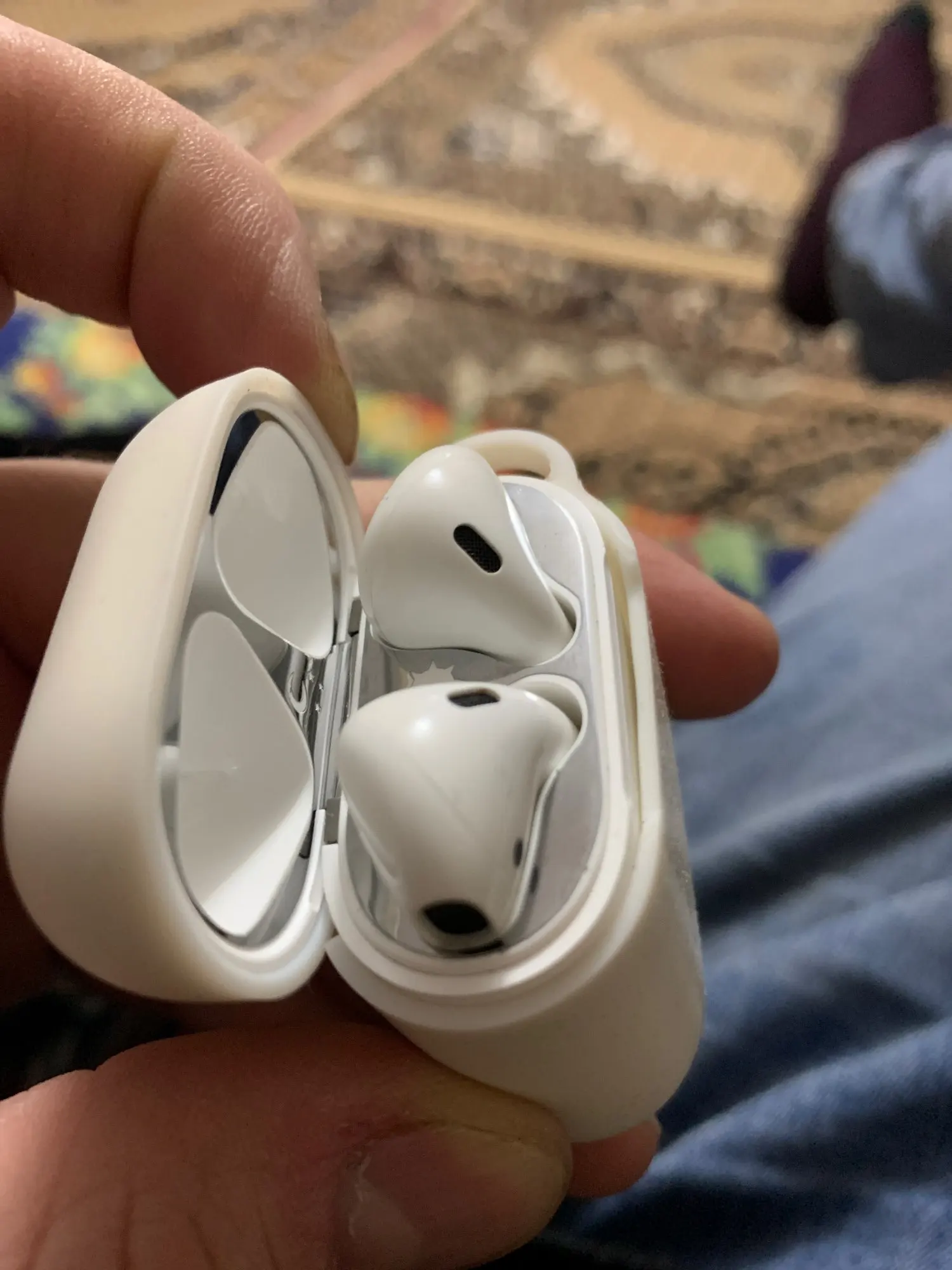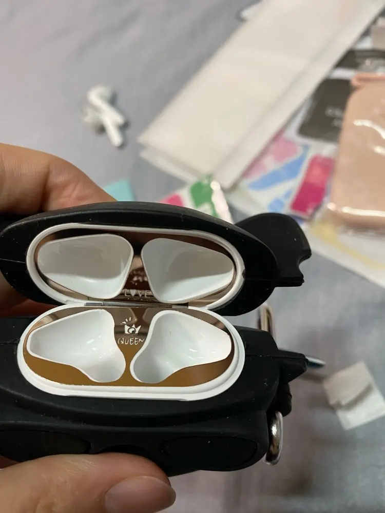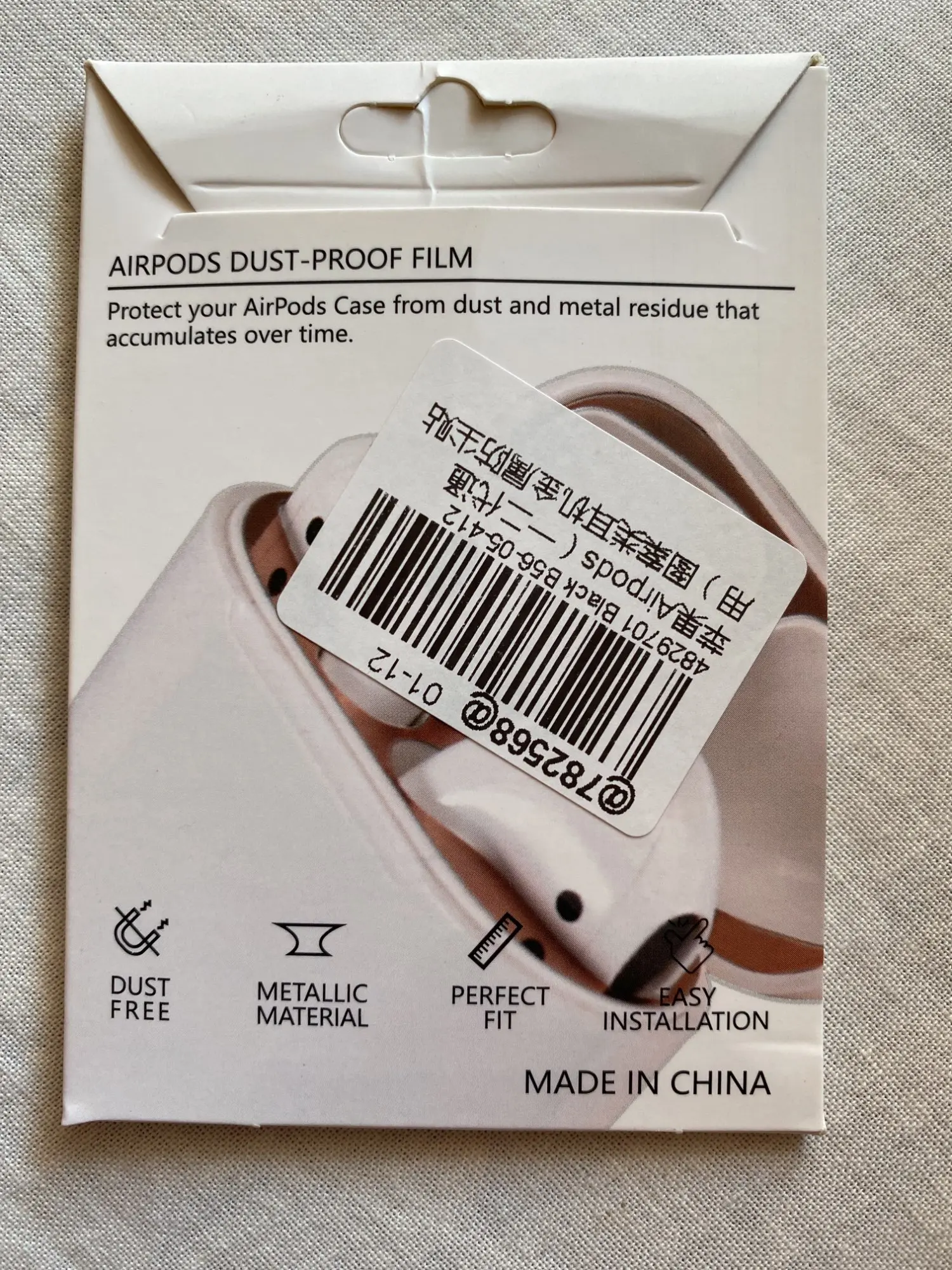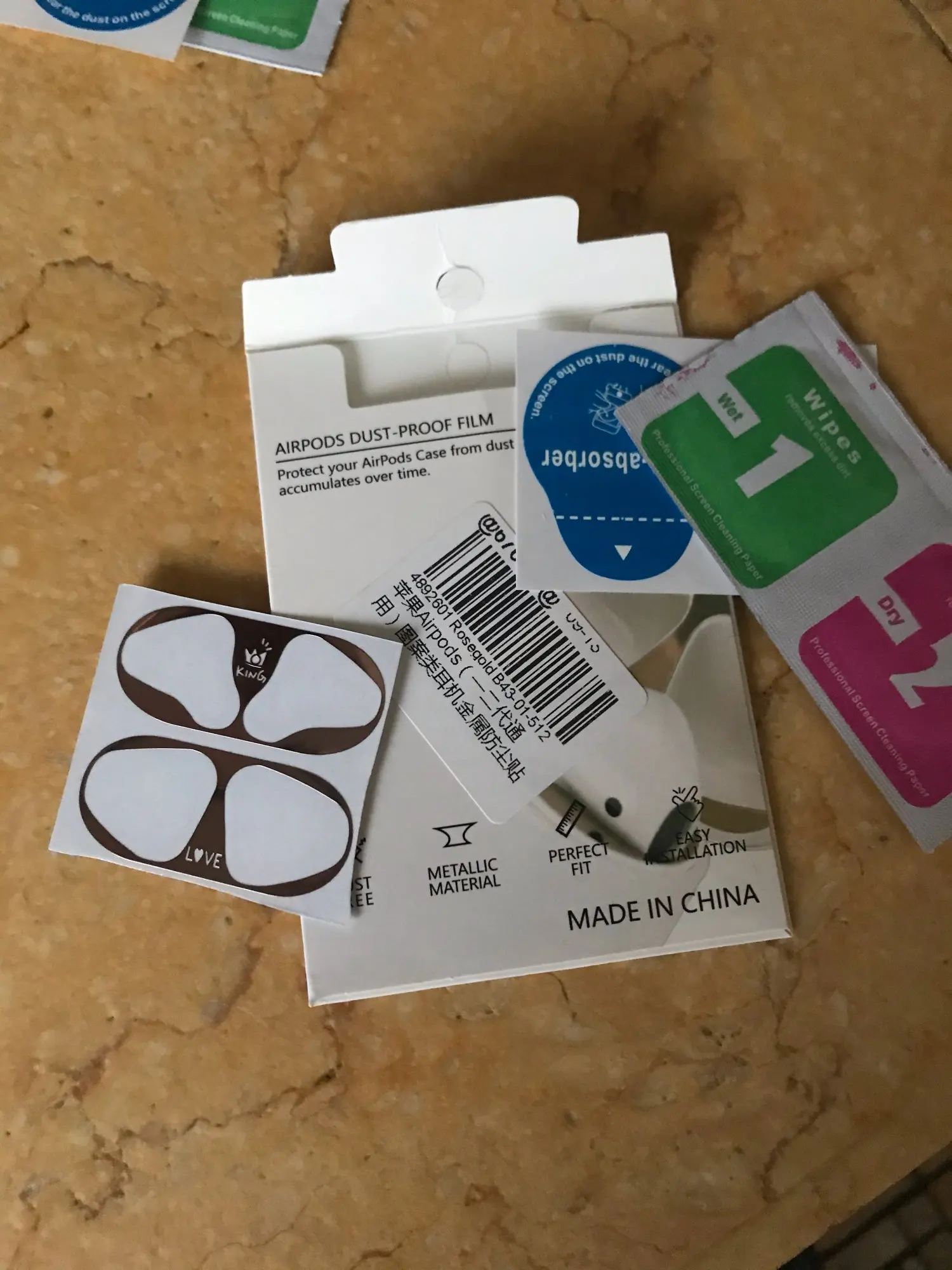 Решил заказать пылезащитные металлические наклейки для своих AirPods, чтобы скомпоновать их с чёрным чехлом и немного кастомизировать. Приехали быстро, за пару недель. Упакованы в картонную коробку. В комплекте: сами наклейки, 2 салфетки и стикеры. Клеятся не очень просто, т.к металлические (так и норовят примагнититься к корпусу). Но выглядит супер! Однозначно рекомендую!