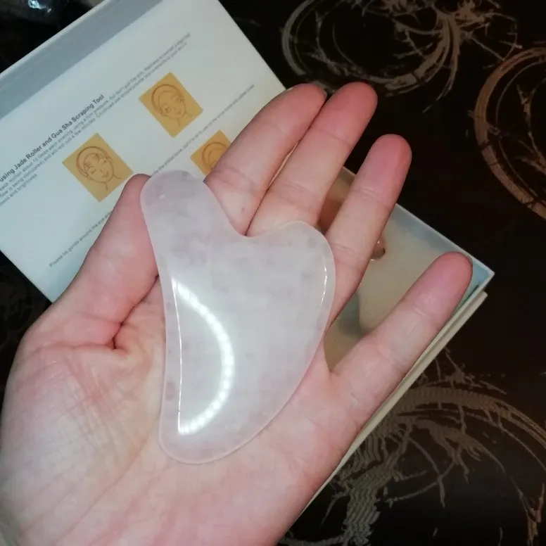 доставка супер быстрая, доставил курьер домой. мне кажется что это настоящий камень, когда начинаешь делать массам, камень холодный и это очень приятно. есть небольшой и совсем незаметный скол на камне гуаша, ролик немного скрипит.