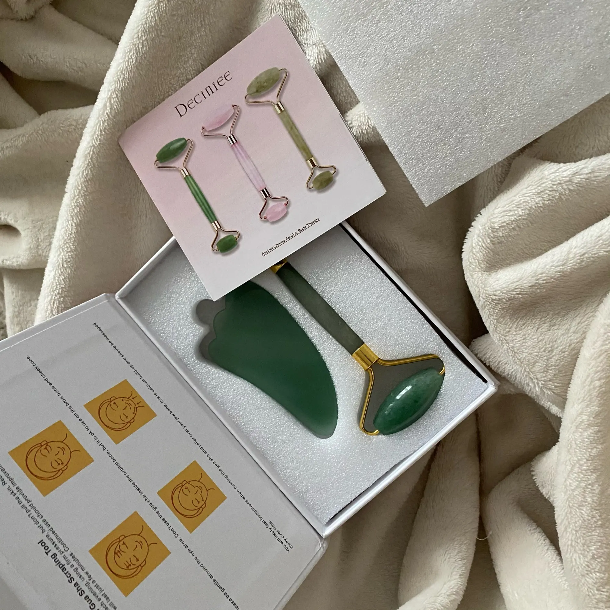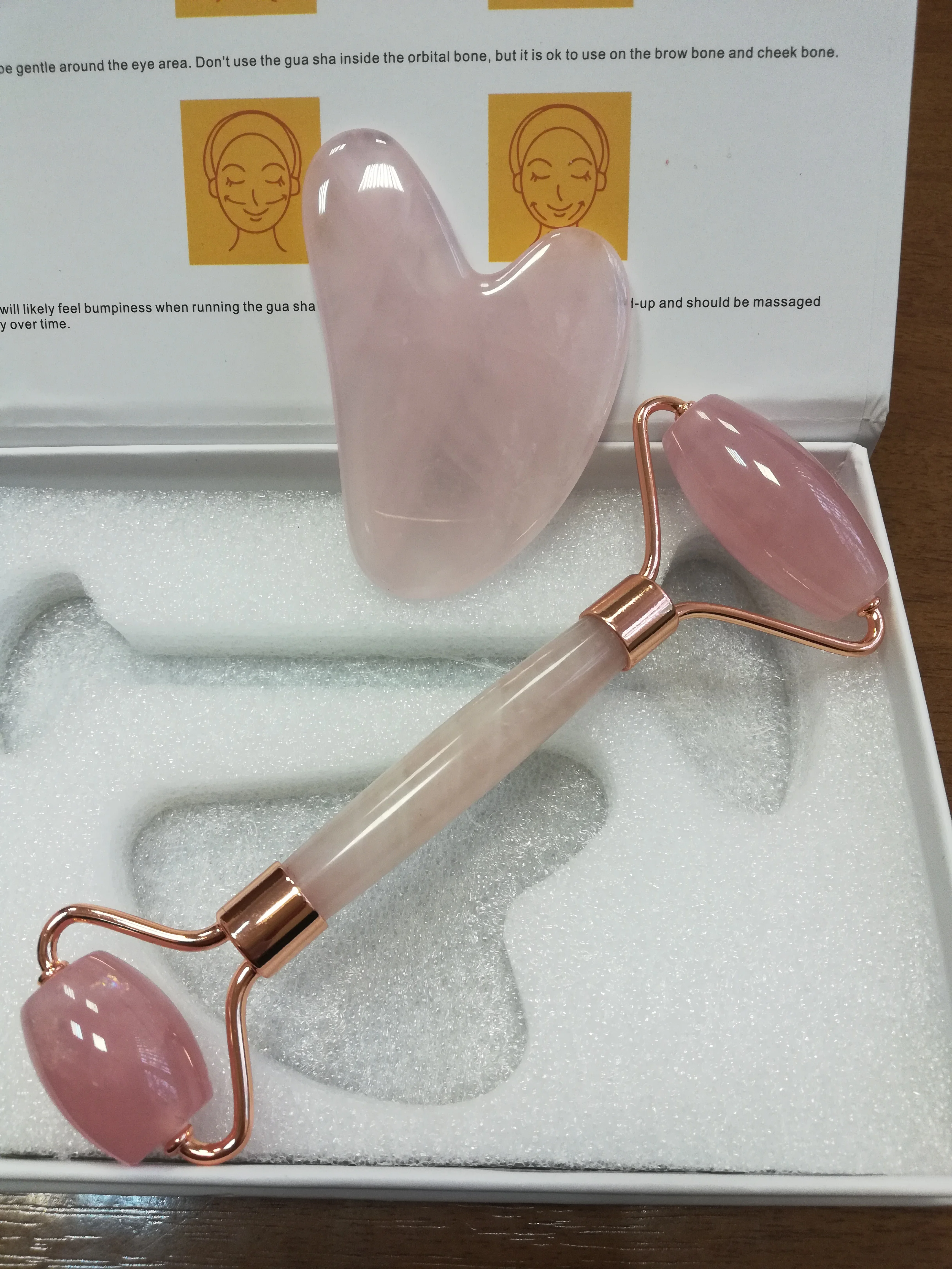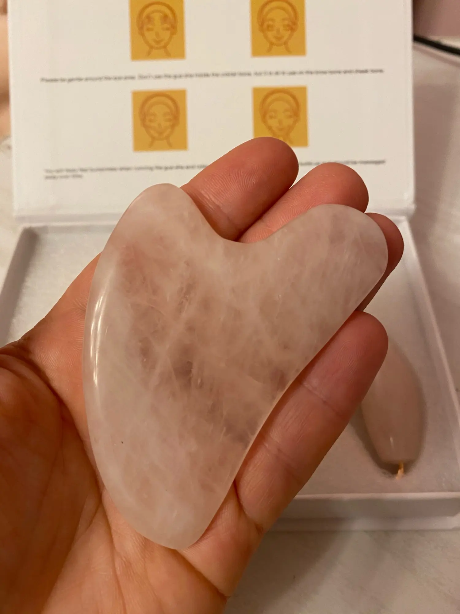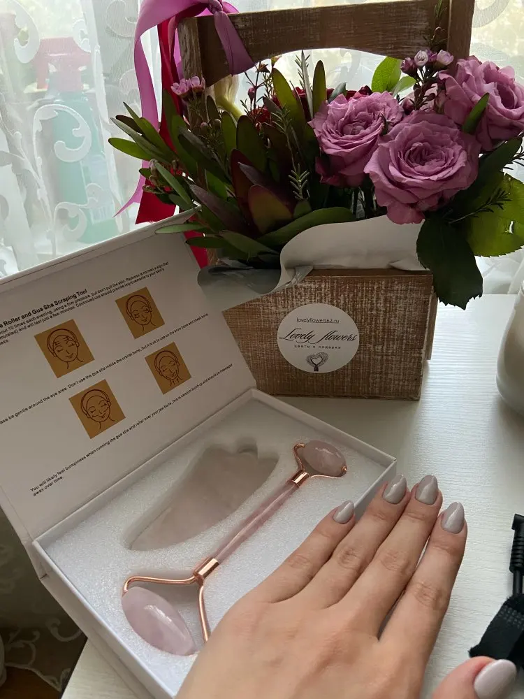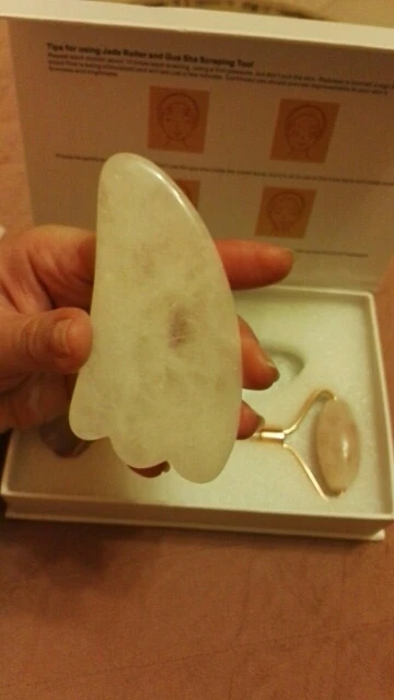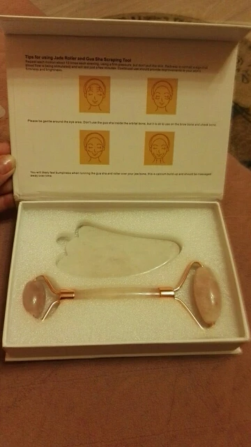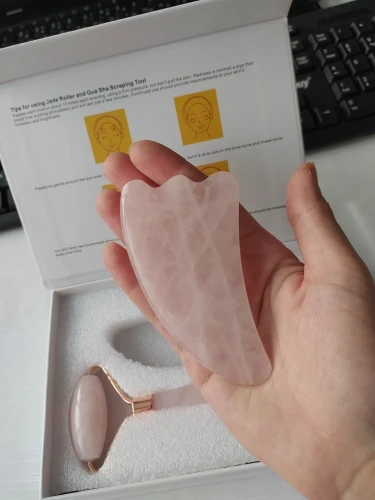 Пришёл набор очень быстро- курьером за 4 дня в МСК. И ролик и скребок гуаша очень красивые! Камни холодные, гладкие, аккуратные! Коробка чуть помялась, но это не критично. Единственное, что пенопласт внутри был неаккуратно вырезан для изделий.. странно даже. Для подарка самое оно, как раз для этого и купила. У этого же продавца есть наборы такие же только в Белостоке цвете дешевле (примерно 66-700₽), но они качеством намного хуже. Камень весь в крапинках, смотрится некрасиво. Этот набор рекомендую.