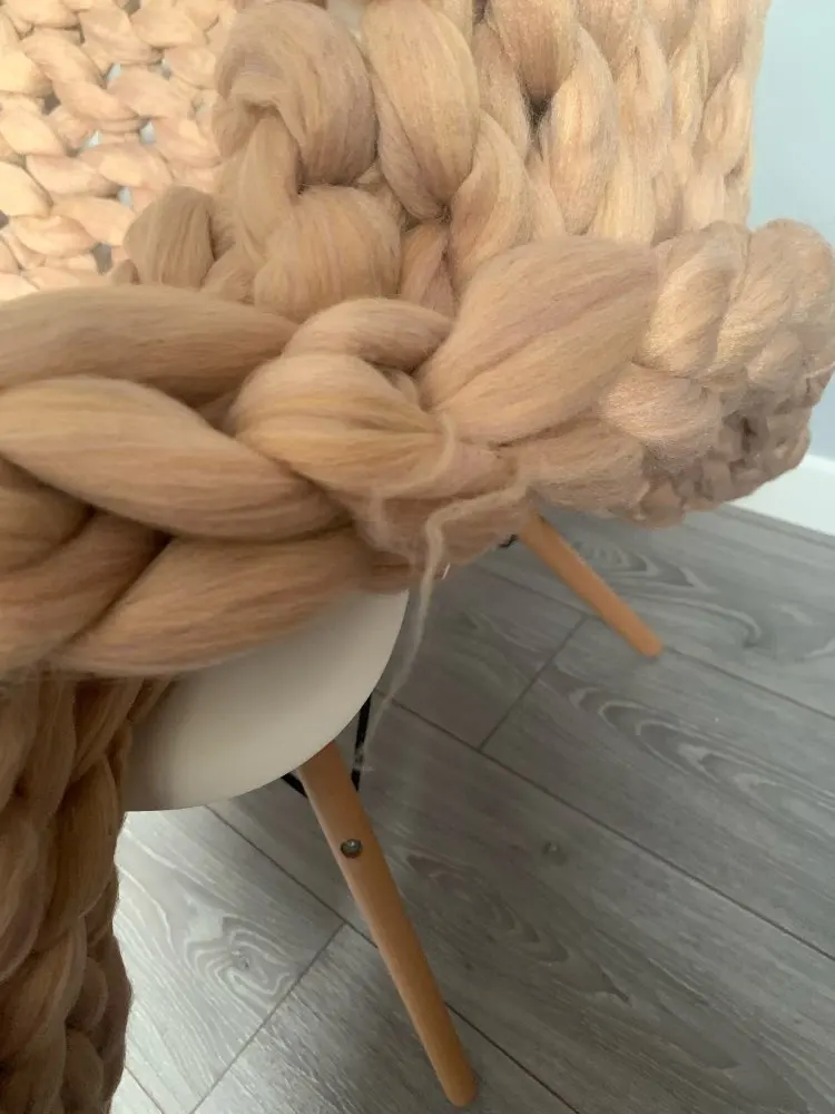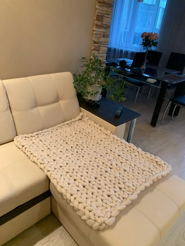 Наконец я его дождалась! Классное покрывало, действительно очень объёмная пряжа, само по себе рыхлое, тянется. Цвет соответствует. Заказывала, чтобы положить в кресло, смотрится отлично. Упаковано было хорошо (пакет посылочный, и ещё два пакета внутри). В целом, покупкой очень довольна. Единственное, доставка долгая, но в срок уложилась