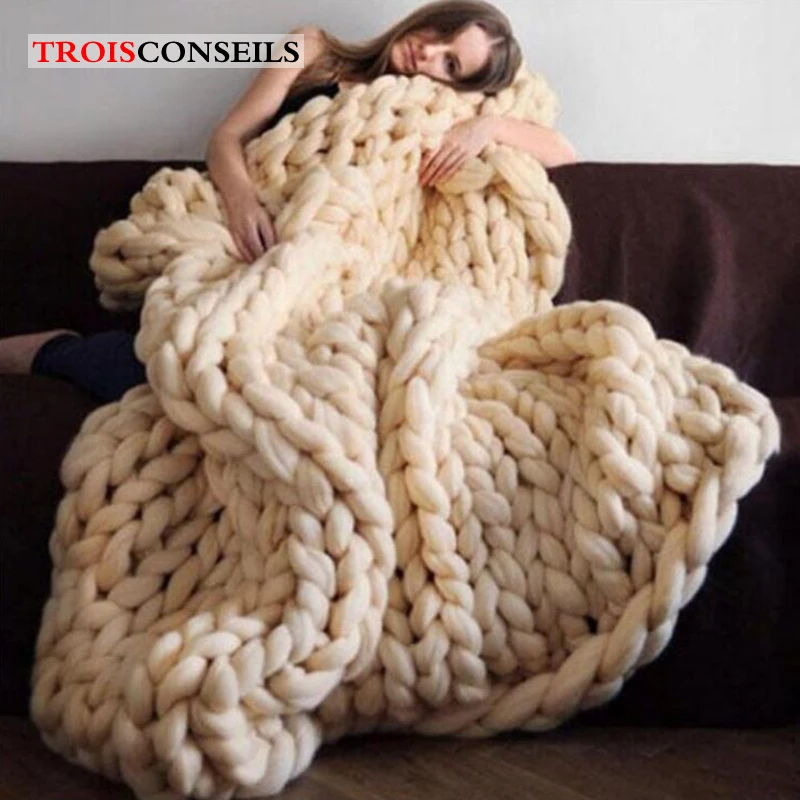 Одеяло ручной работы из шерсти мериноса, толстое, крупная пряжа, вязаное, клетчатое, теплое, для дивана