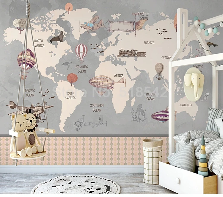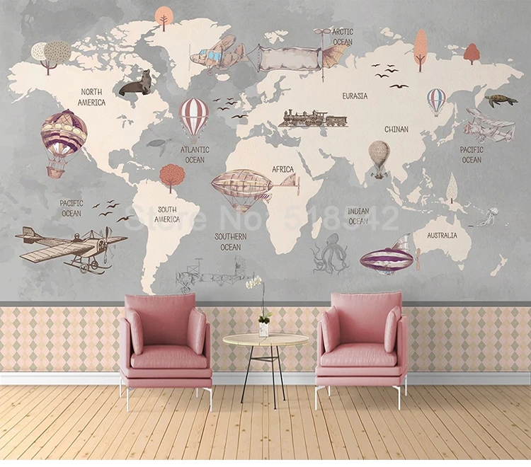 Большие росписи в стиле ретро с изображением карты мира на заказ, расписанные вручную воздушными шарами самолета, детской комнаты, для мальчиков, спальни, декоративные Фотообои