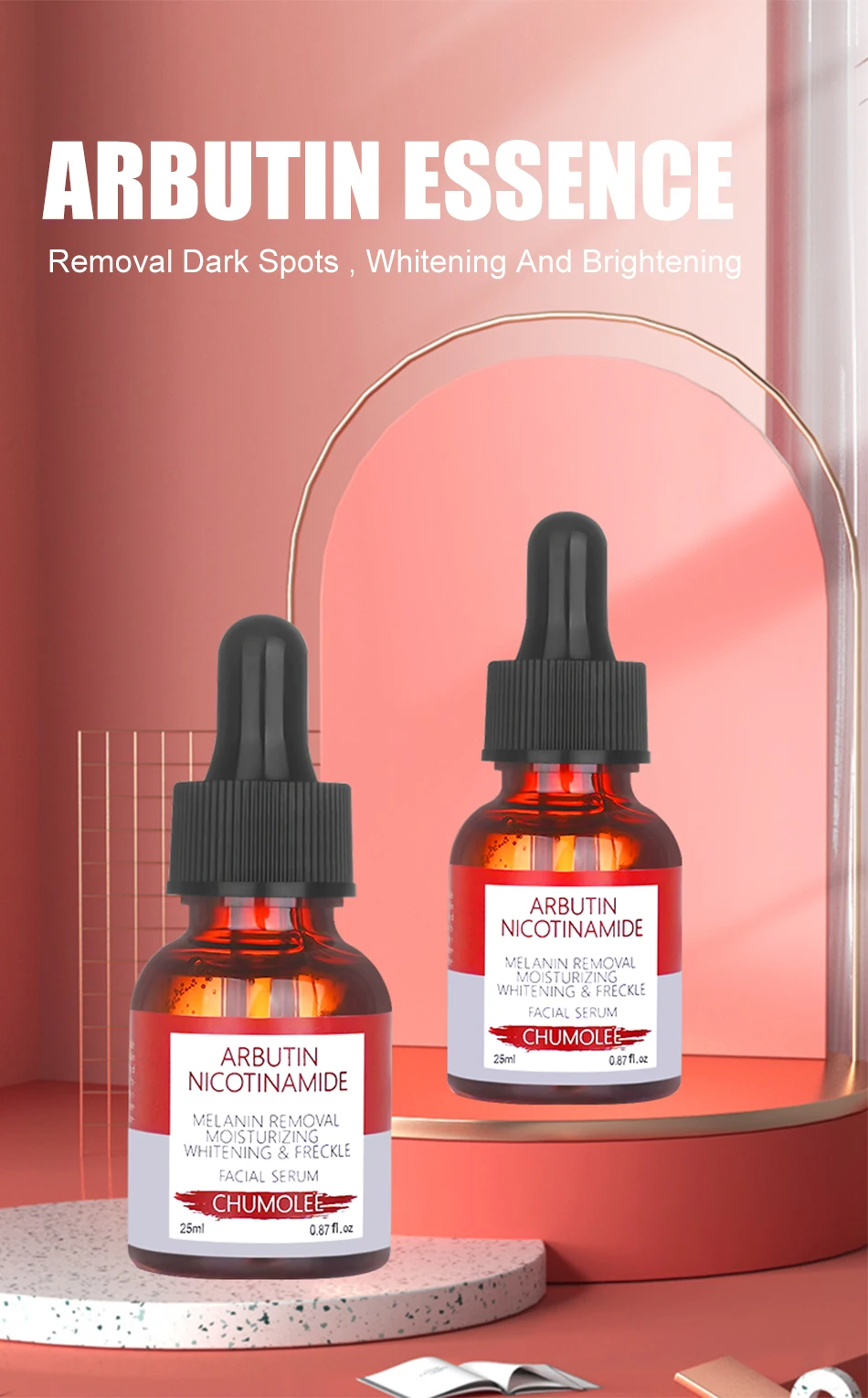 Содержит арбутин и никотинамид, может быстро проникать в кожу, эффективно препятствует активности тирозиназа в коже, блокирует образование меланина, И непосредственно сочетаются с тирозиназой для ускорения разложения и выведения меланина. Уменьшает пигментацию кожи, удаляет пятна и веснушки и не вызывает токсичных, раздражающих, аллергенных воздействий на меланоциты, делает кожу яркой и гладкой