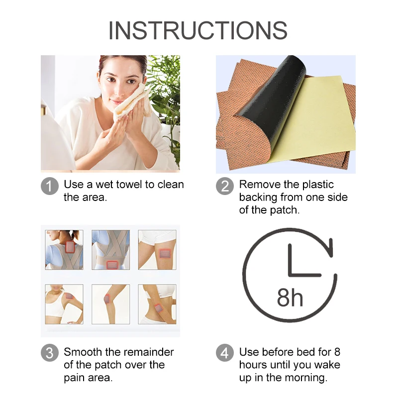 Инструкции по использованию:1. Вымойте руки перед нанесением заплатки.2. Очистите и высушите поврежденную область.3. Согните пластырь и отсоедините пленку, чтобы разоблачить часть клейкой стороны.4. Нанесите клейкую сторону непосредственно на кожу в пораженной области.5. Снимите пластиковую пленку, сползая назад6. Нанесите только 1 патч на поврежденную область, это может быть оставлено на месте до 8-12 часов.7. Мойте руки после удаления пластыри.8. Если боль повторяется через 8-12 часов после нанесения первого патча, может быть применен второй пластырь. Пожалуйста, удалите Первый патч перед