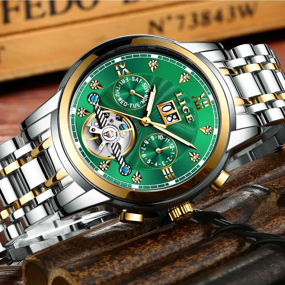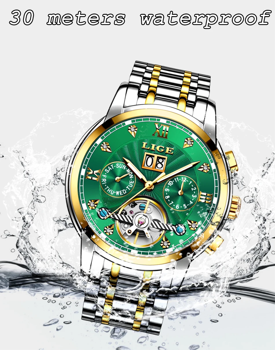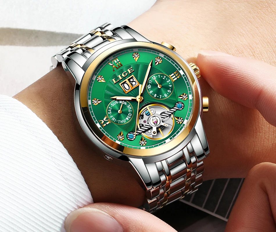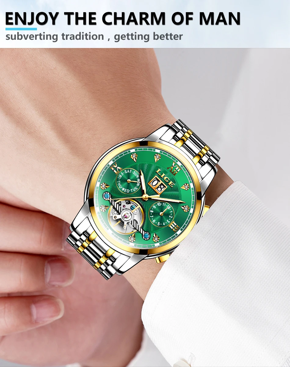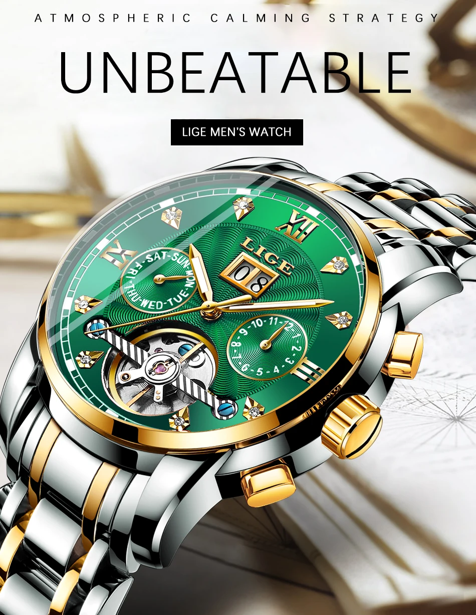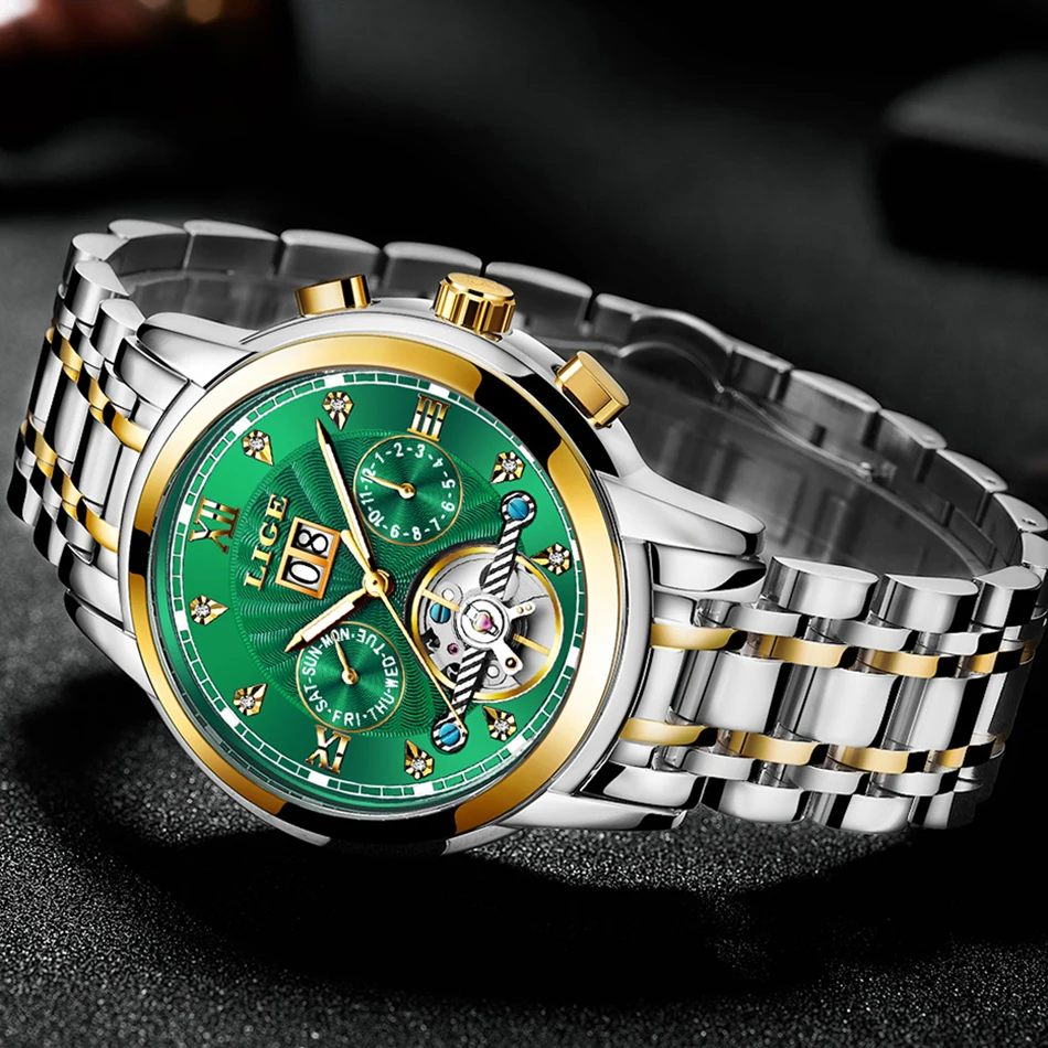 Часы LIGE Мужские механические зеленые, модные брендовые Роскошные ...