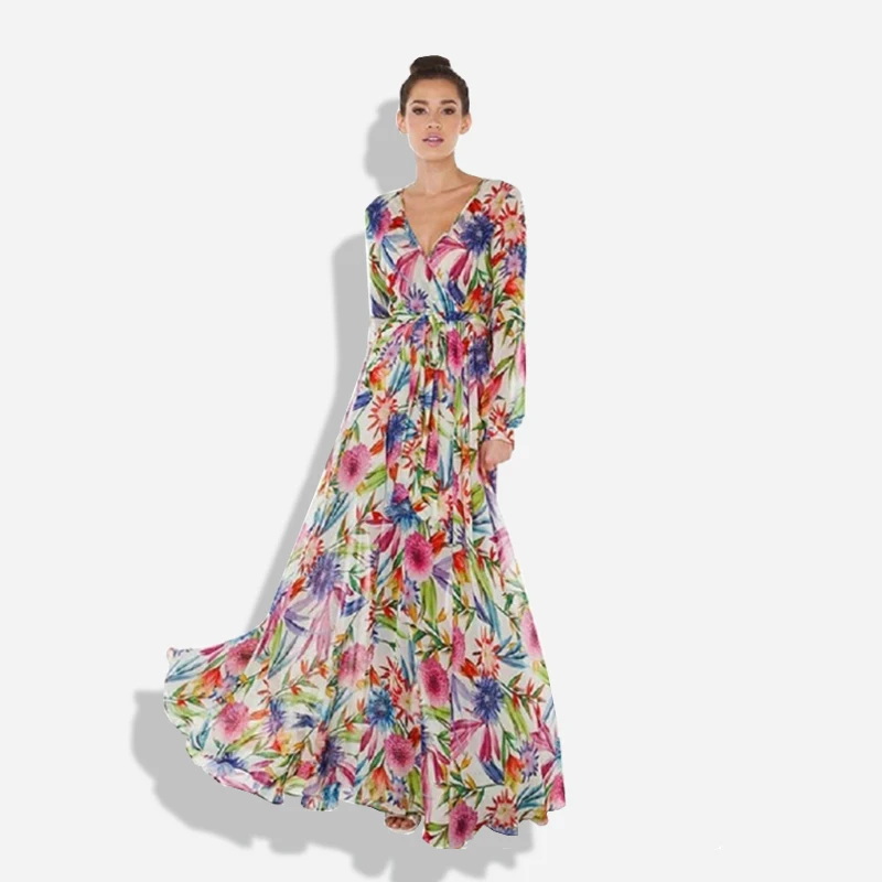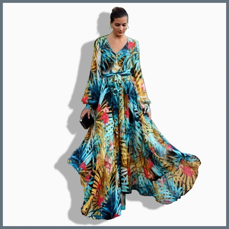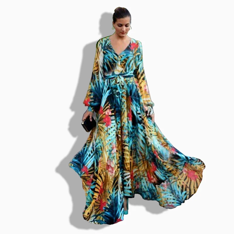 Женский Сарафан Макси, винтажный сарафан с длинным рукавом, V-образ...