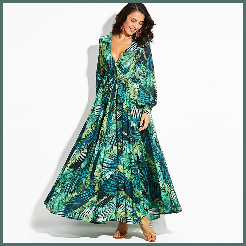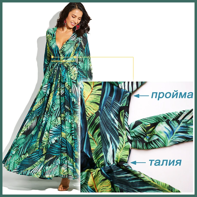 Женское платье-туника с длинным рукавом, зеленое платье с принтом и глубоким v-образным вырезом размера плюс 5XL, повседневное праздничное платье для вечеринки