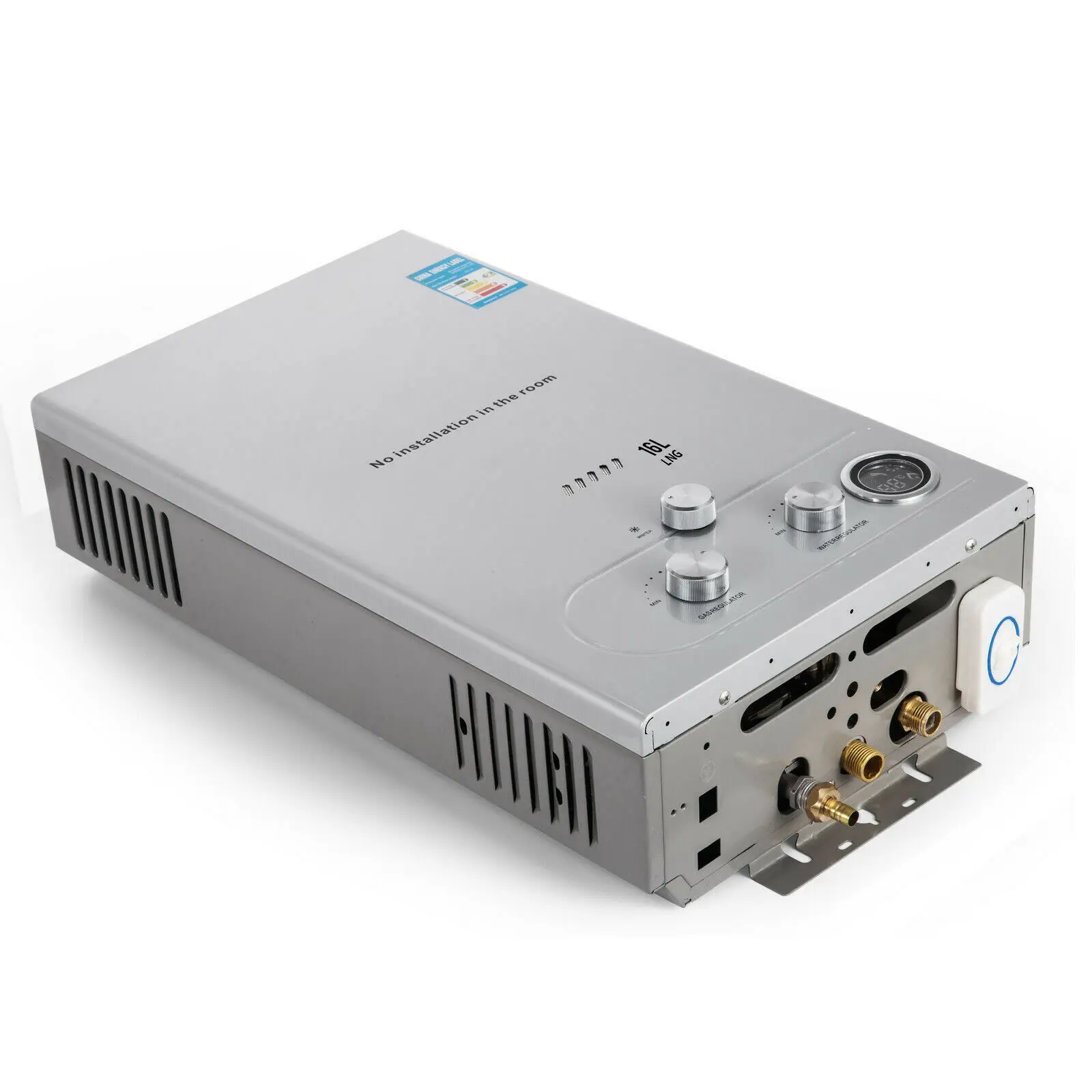 16 л/мин мгновенный газовый водонагреватель, светильник и экономия пространства. Настенный дизайн, душ в ванной комнате, когда машина установлена на кухне, что позволяет избежать утечки токсичного газа во время купания. В комплект входит насадка для душа в подарок.