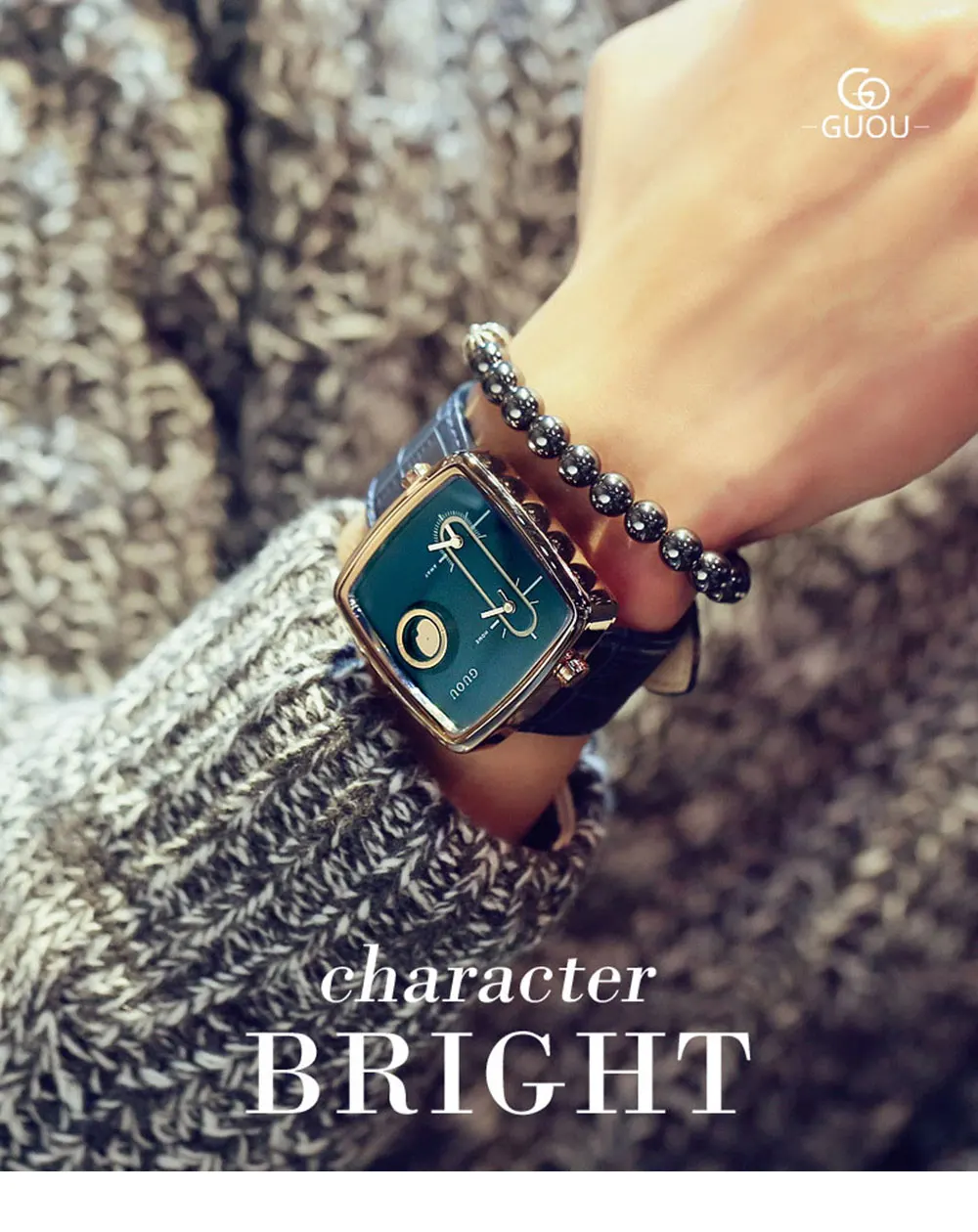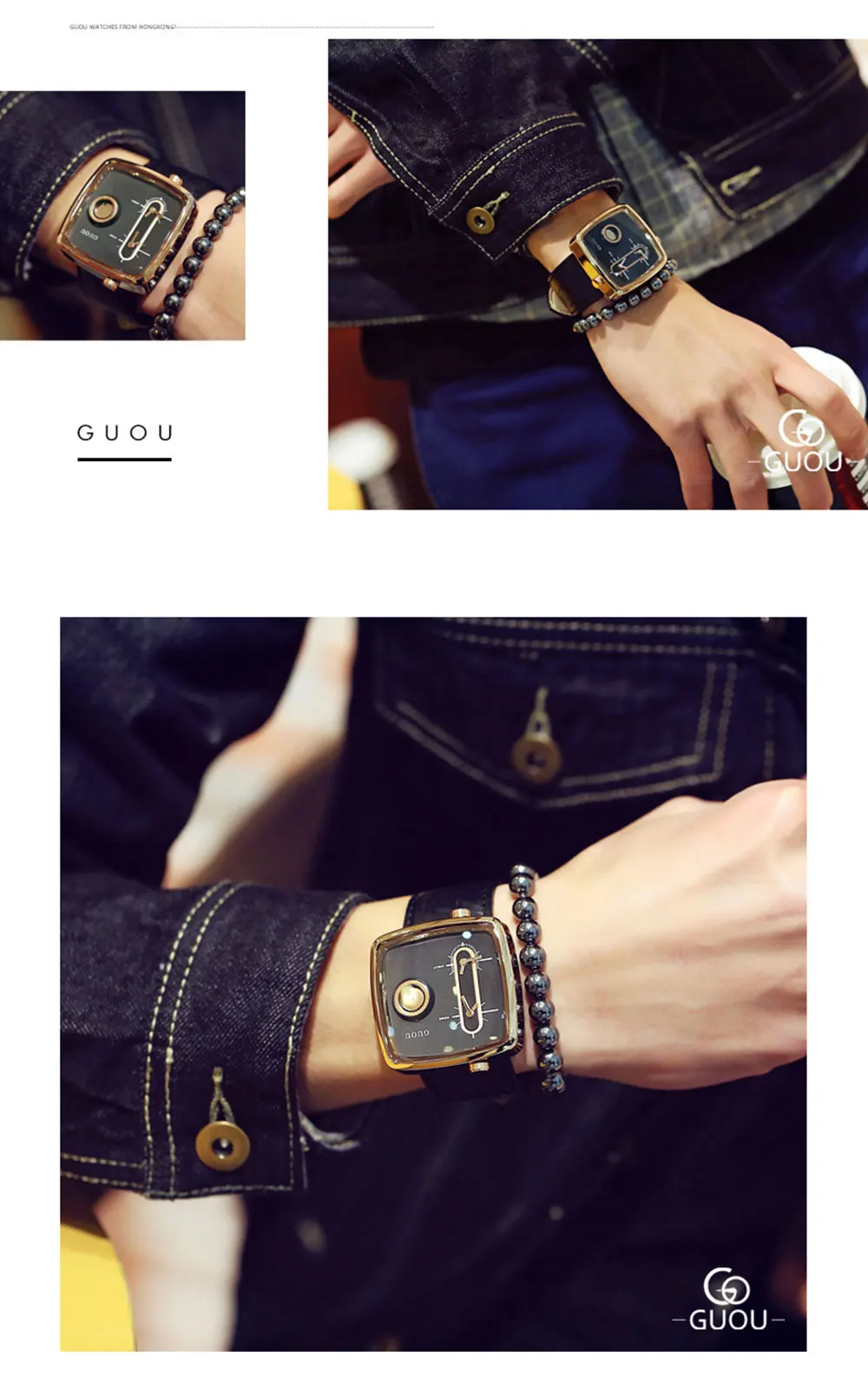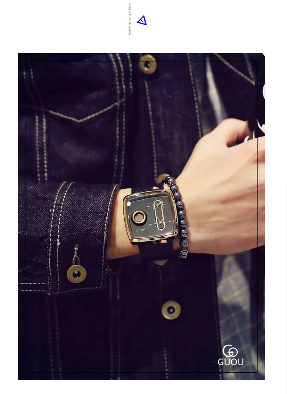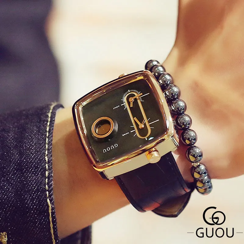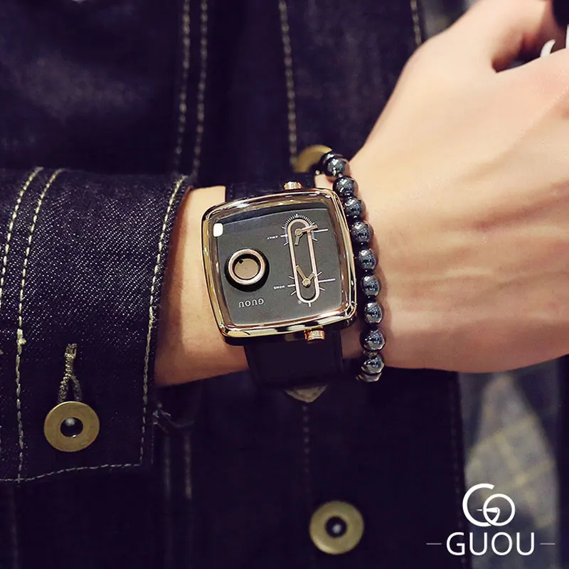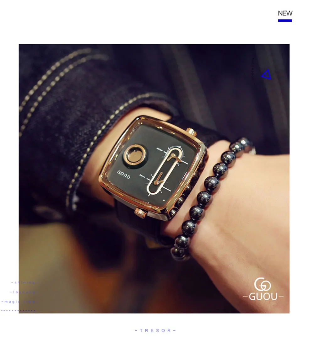 Часы наручные Guou мужские с двойным кварцевым механизмом, модные брендовые Роскошные с квадратным циферблатом командира из воловьей кожи, популярный товар