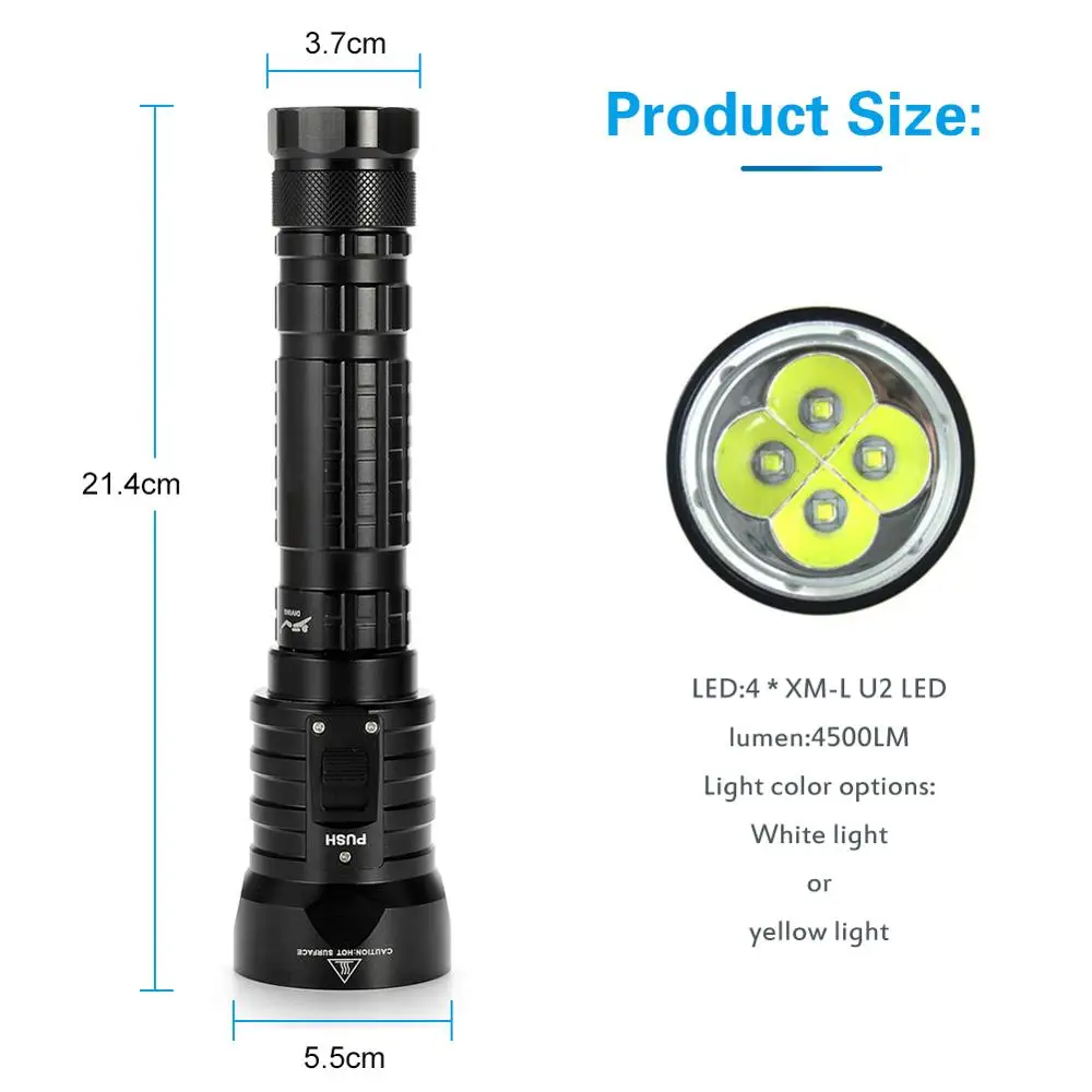Технические характеристики: Модель продукта: DX4 Материалы: летательный аппарат Алюминий Светодиодный: 4 * XM-L U2 Светильник Цвет: белый Световой поток: Max.8000lms Источник питания: 2*18650 литиевая батарея (с трубкой) / 2*26650 литиевая батарея (без трубки) (не входит в комплект) Водонепроницаемый: IPX8 Глубина погружения: макс. 50 м Товар Вес: 368g/12,9 oz Особенности: Ручной тип с противоскользящей поверхностью, легко носить с собой. Прочный алюминиевый корпус самолета и линзы из закаленного стекла, очень антиабразивные и прочные. Уровень водонепроницаемости IPX8, глубина погружения до 50 метров, специально для дайверов. С 4 шт Высокое качество XM-L U2 светодиодный, максимальная выходная яркость может достигать 8000 люменов, рассеивает темноту вокруг вас даже под водой. С 3 функциональными режимами: низкий светильник, высокий светильник и стробоскоп. Магнитный пружинный задний переключатель, легко управлять и менять режимы. Поддержка 2 различных типов (18650 и 26650) перезаряжаемых батарей. (не входят в комплект) Подходит для дайвинга, кемпинга, охоты, рыбалки и других видов активного отдыха. A. Посылка включает в себя: 1 фонарик (аккумулятор и зарядное устройство в комплект не входят) 2 x лампа прямого накала B. Посылка включает в себя: Фонарь (1 шт.) 2x18650 батарея 1 x Зарядное устройство 2 x лампа прямого накала C. Посылка включает в себя: Фонарь (1 шт.) 2x26650 батарея 1 x Зарядное устройство 2 x лампа прямого накала