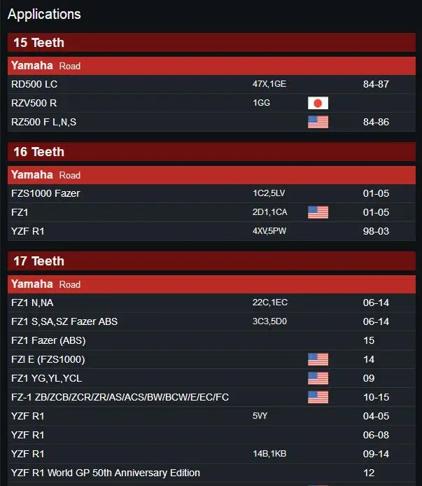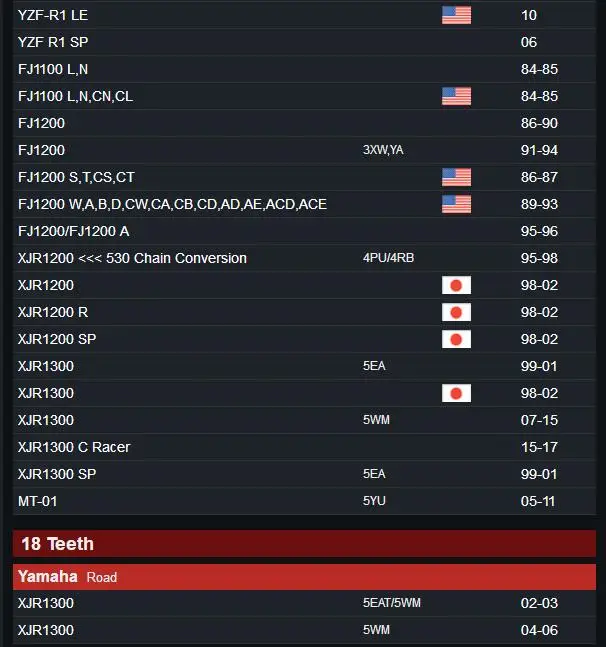 16 зубьевYamaha RoadFZS1000 Fazer1C2,5LV 01-05FZ12D1,1CAUSA01-05YZF R1 4XV,5PW 98-0317 зубовYamaha RoadFZ1 N,NA22C,1EC 06-14FZ1 S,SA,SZ Fazer ABS3C3,5D0 06-14FZ1 Fazer (ABS) 15FZI E (FZS1000) USA14FZ1 YG,YL,YCL USA09FZ-1 ZB/ZCB/ZCR/ZR/AS/ACS/BW/BCW/E/EC/FC USA10-15YZF R15VY 04-05YZF R1 06-08YZF R114B,1KB 09-14YZF R1 World GP 50th Anniversary Edition 12YZF-R1 LE USA10YZF R1 SP 06FJ1100 L,N 84-85FJ1100 L,N,CN,CL USA84-85FJ1200 86-90FJ1200 3XW,YA 91-94FJ1200 S,T,CS,CT USA86-87FJ1200 W,A,B,D,CW,CA,CB,CD,AD,AE,ACD,ACE USA89-93FJ1200/FJ1200 A 95-96XJR1200 <530 преобразователь цепи 4pu/4RB 95-98XJR1200 Japan98-02XJR1200 R Japan98-02XJR1200 SP Japan98-02XJR13005EA 99-01XJR1300 Japan98-02XJR13005WM 07-15XJR1300 C Racer 15-17XJR1300 SP5EA 99-01MT-015YU 05-1118 зубьевYamaha RoadXJR13005EAT/5WM 02-03XJR13005WM 04-06