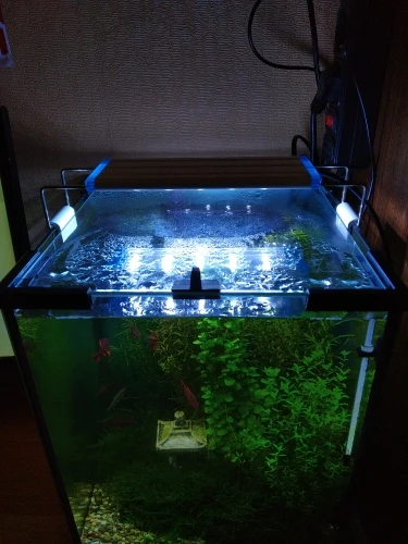 Лампа тонкая, легко крепится на аквариуме. Удобные расширители. Лампа греется, надеюсь это не критично. Быстрая доставка. Продавец молодец, всё быстро отправил. Переживаю только за то, чтобы от такого яркого света не пошли водоросли. Решили, что будем включать часа на три, остальное время спокойный свет.