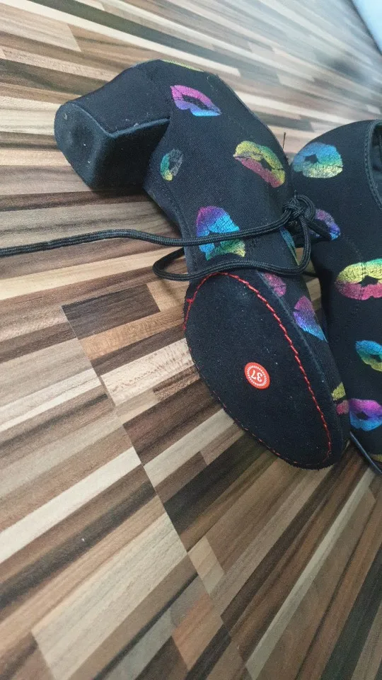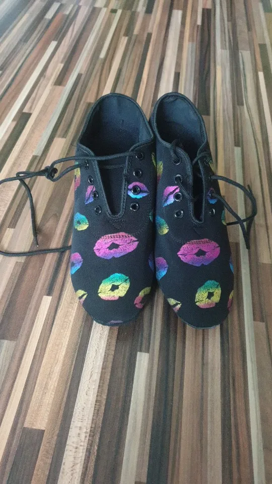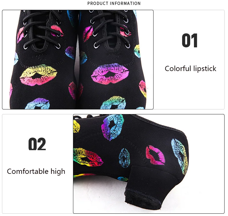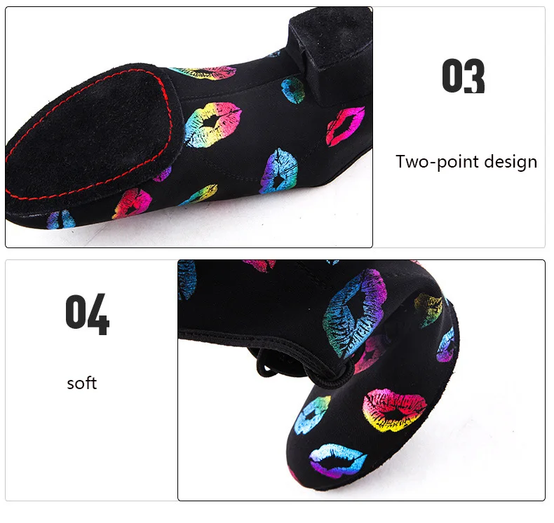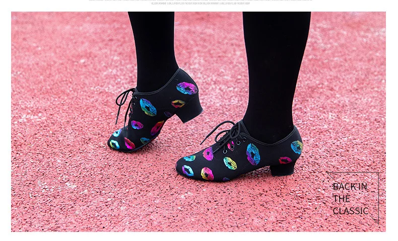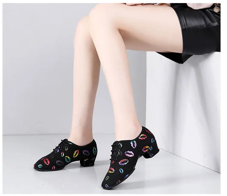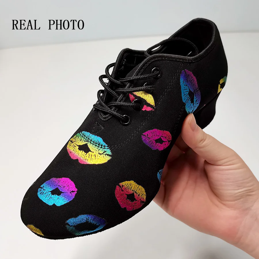 Женские танцевальные туфли, черные, красные, с принтом в виде губ