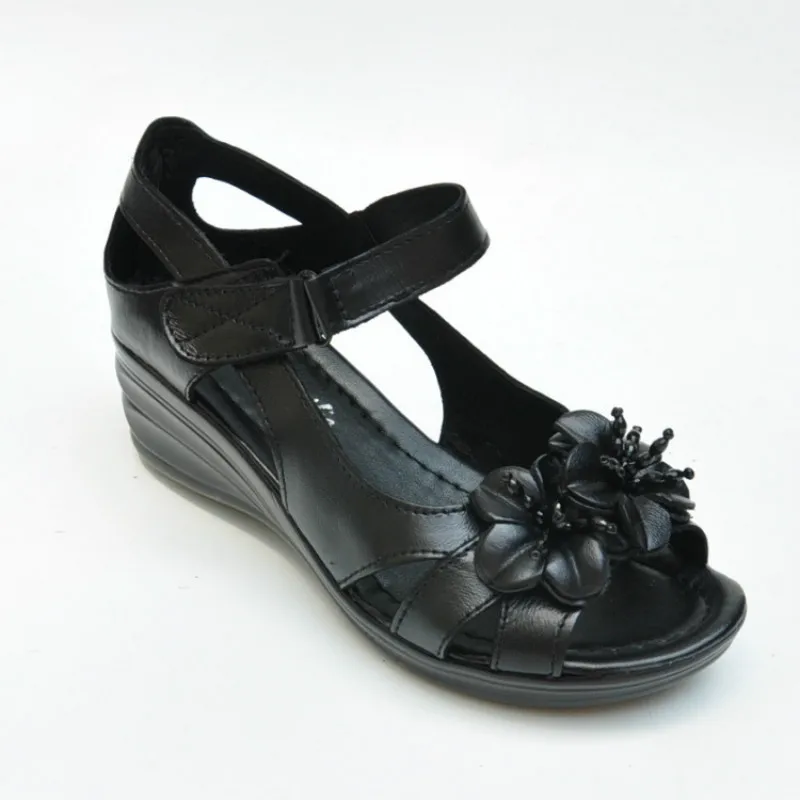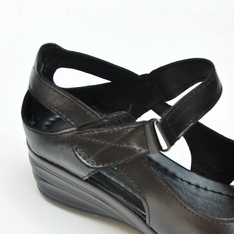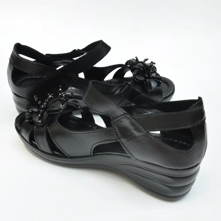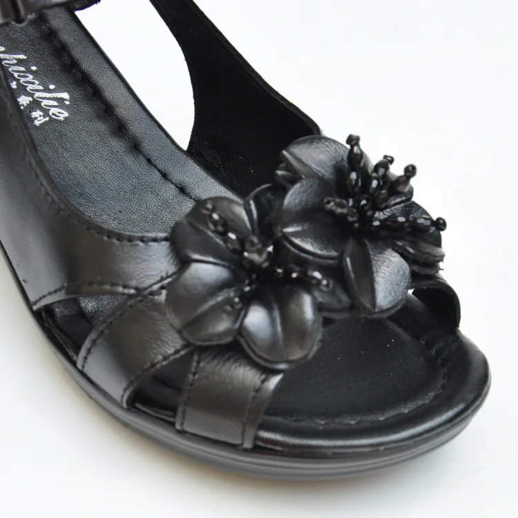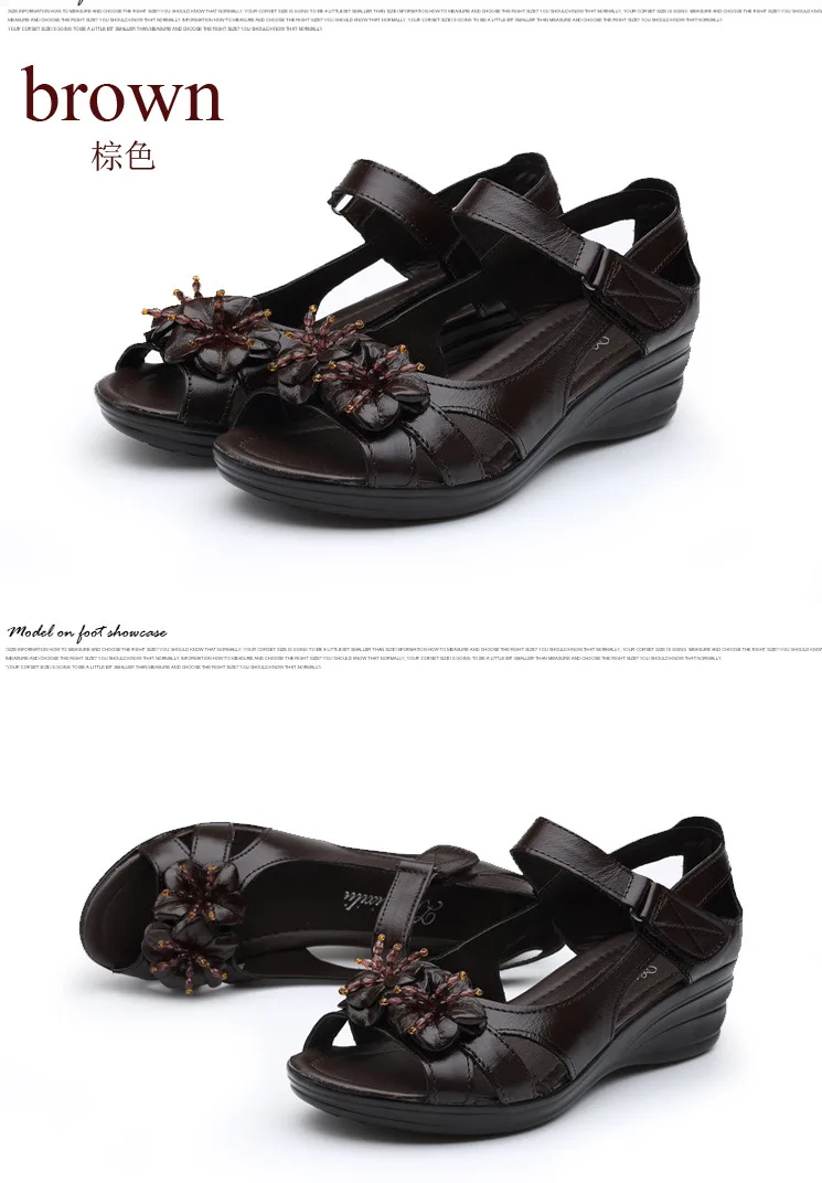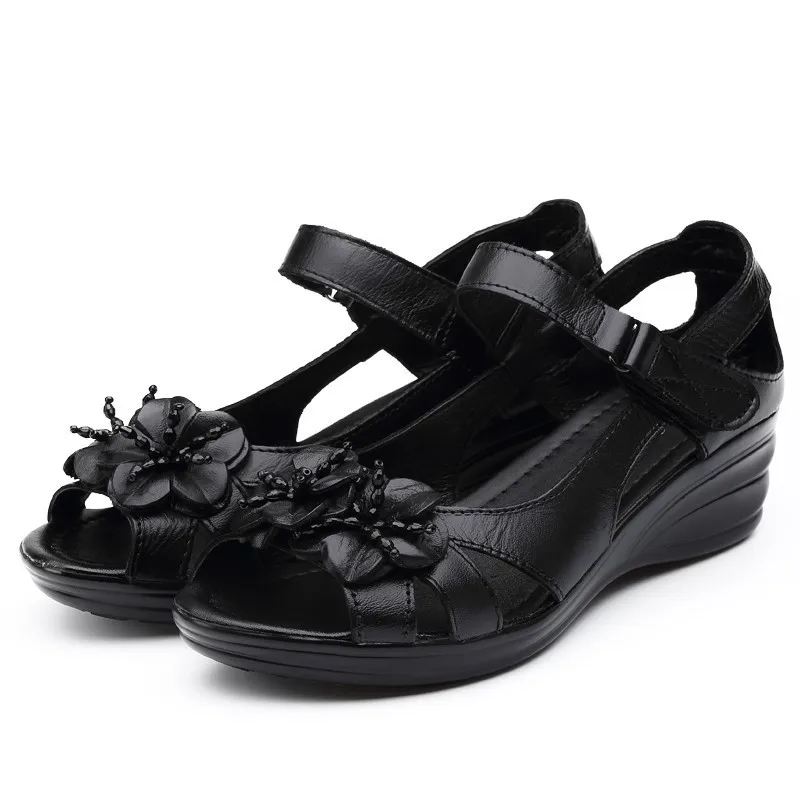 SWONCOЛетняя обувь из натуральной кожи; Черные сандалии для женщин; Новинка 2020 года; Повседневная обувь на танкетке; Сандалии с цветочным принтом для мам; Обувь на платформе с открытым носком