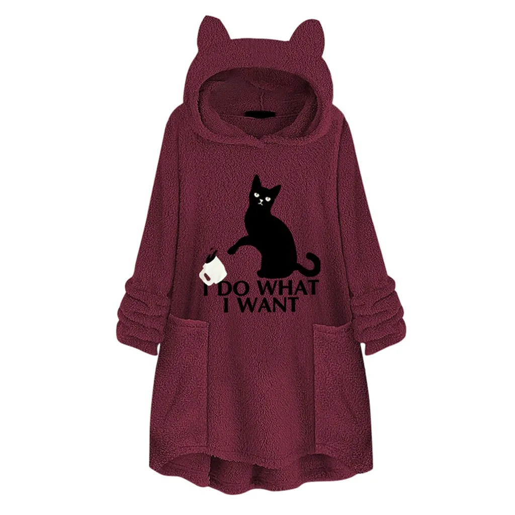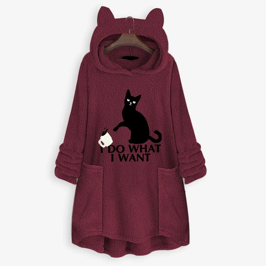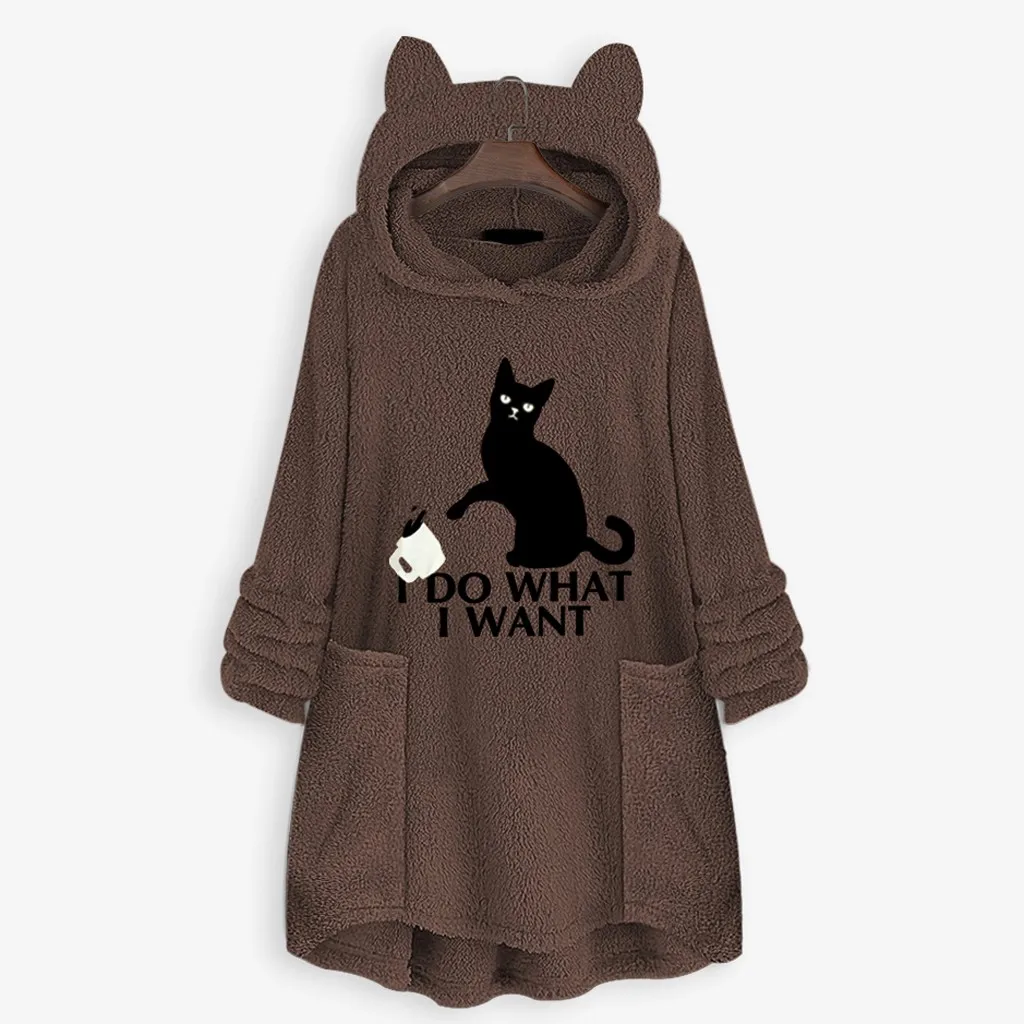 Женский флисовый свитер с вышитыми кошачьими ушками размера плюс с капюшоном и карманом