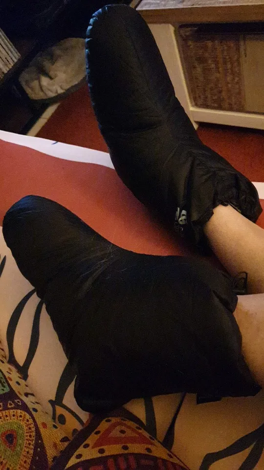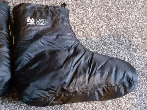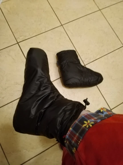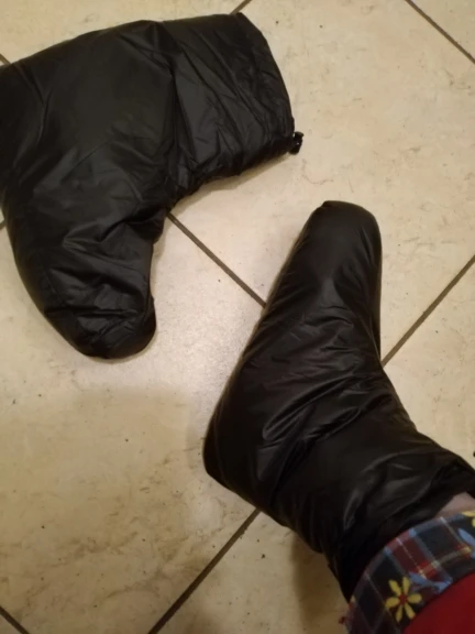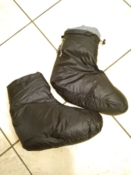 Довольно теплые "чехлы для ног". На 43 российский размер сели хорошо (вместе с тонким флисовым носком). Мне кажется, на 44 размер могут быть уже тесноваты. Пакуются в очень компактный мешочек, внутри однозначно пух (не синтетика). Для обуви не годятся. Взял для командировок - спать в спальнике или чилить на койке, если поселят в прохладное место.