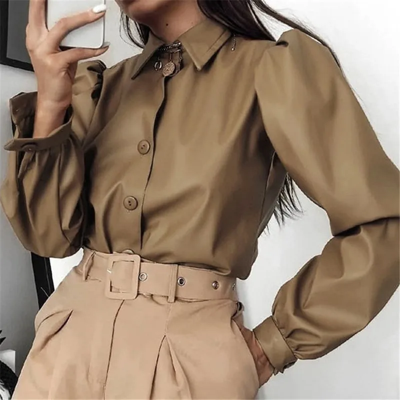 Женская матовая Повседневная рубашка из искусственной кожи с длинными рукавами-фонариками, топы из искусственной кожи в винтажном стиле, модель 2020 года, весна-осень
